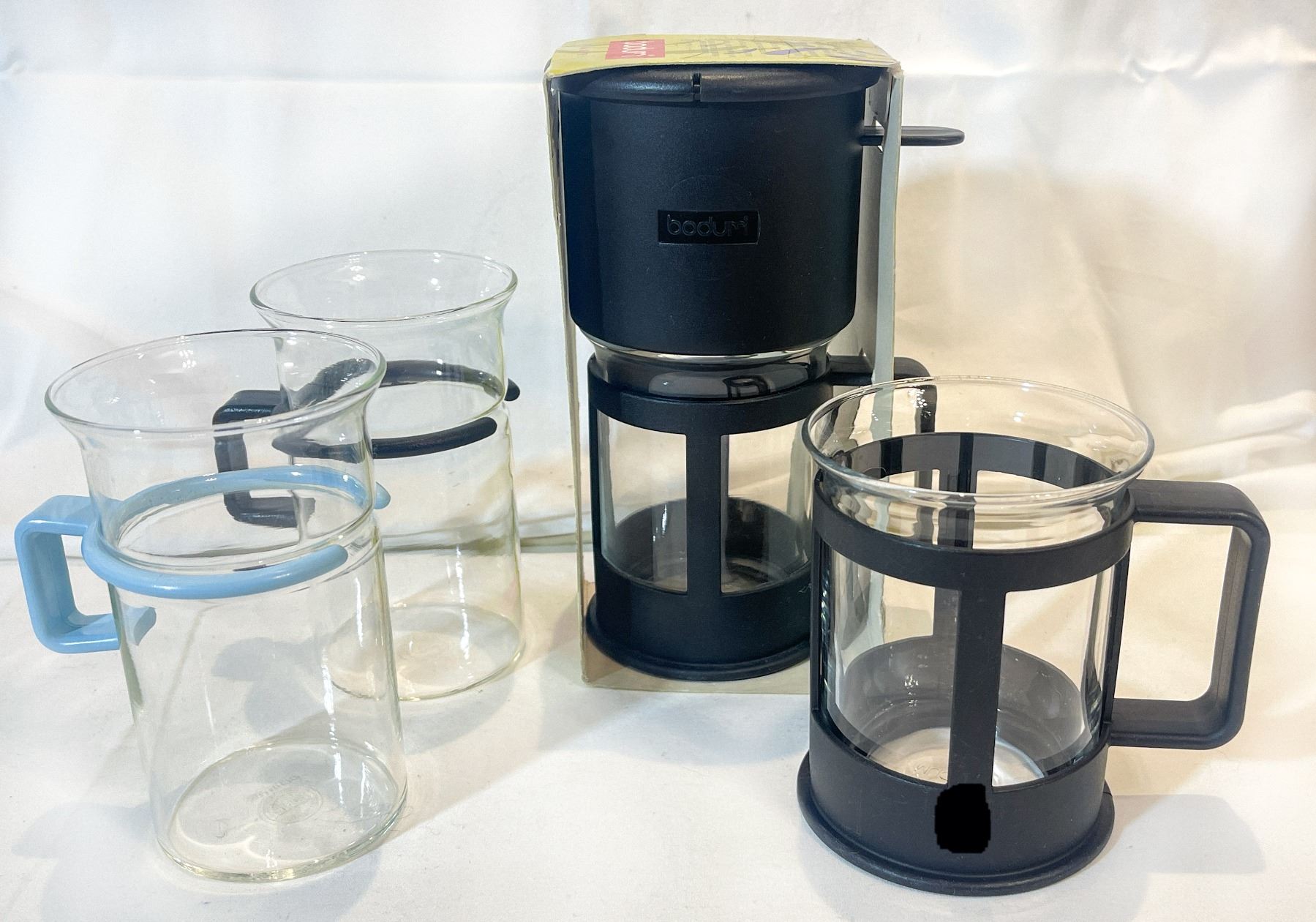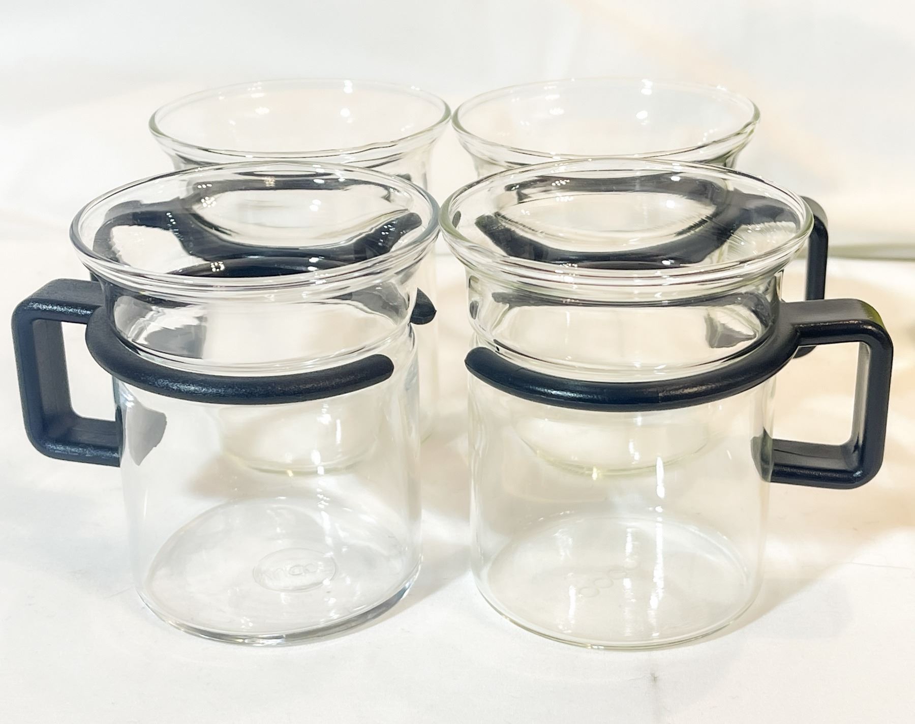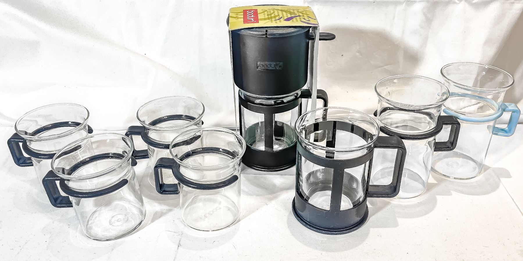 Large vintage Bodum lot featuring the iconic “Picard Cups” — the same glass and plastic-handled mugs made famous by Captain Picard in Star Trek: The Next Generation. Includes a Bodum Solo pour over set and an additional 7 cups/mugs (six black, one light blue), all with removable glass inserts and sleek modernist design. Highly sought-after by Star Trek fans and mid-century design collectors alike. Excellent vintage condition with minor wear consistent with age.