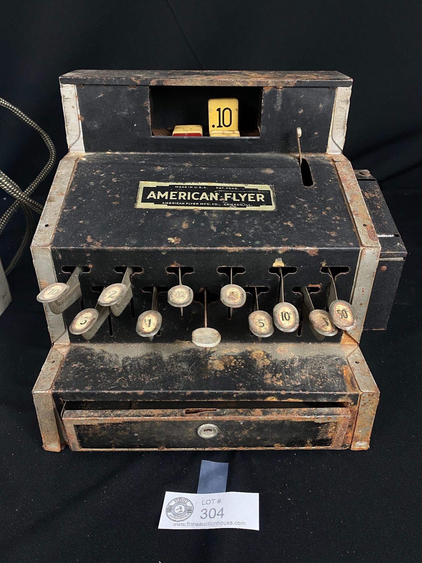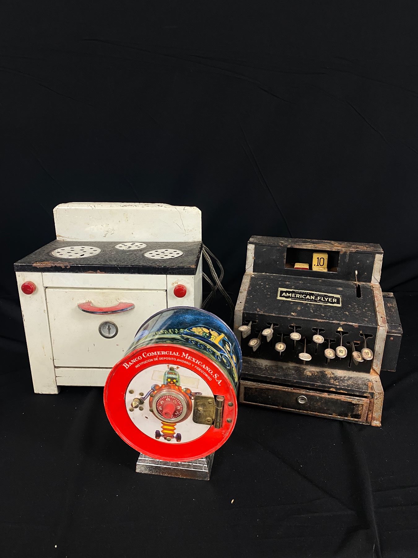 Collectible Lot Including Vintage American Flyer Cash Register, Danby Children's Metal Stove, Brass Boot Vase, Etc.