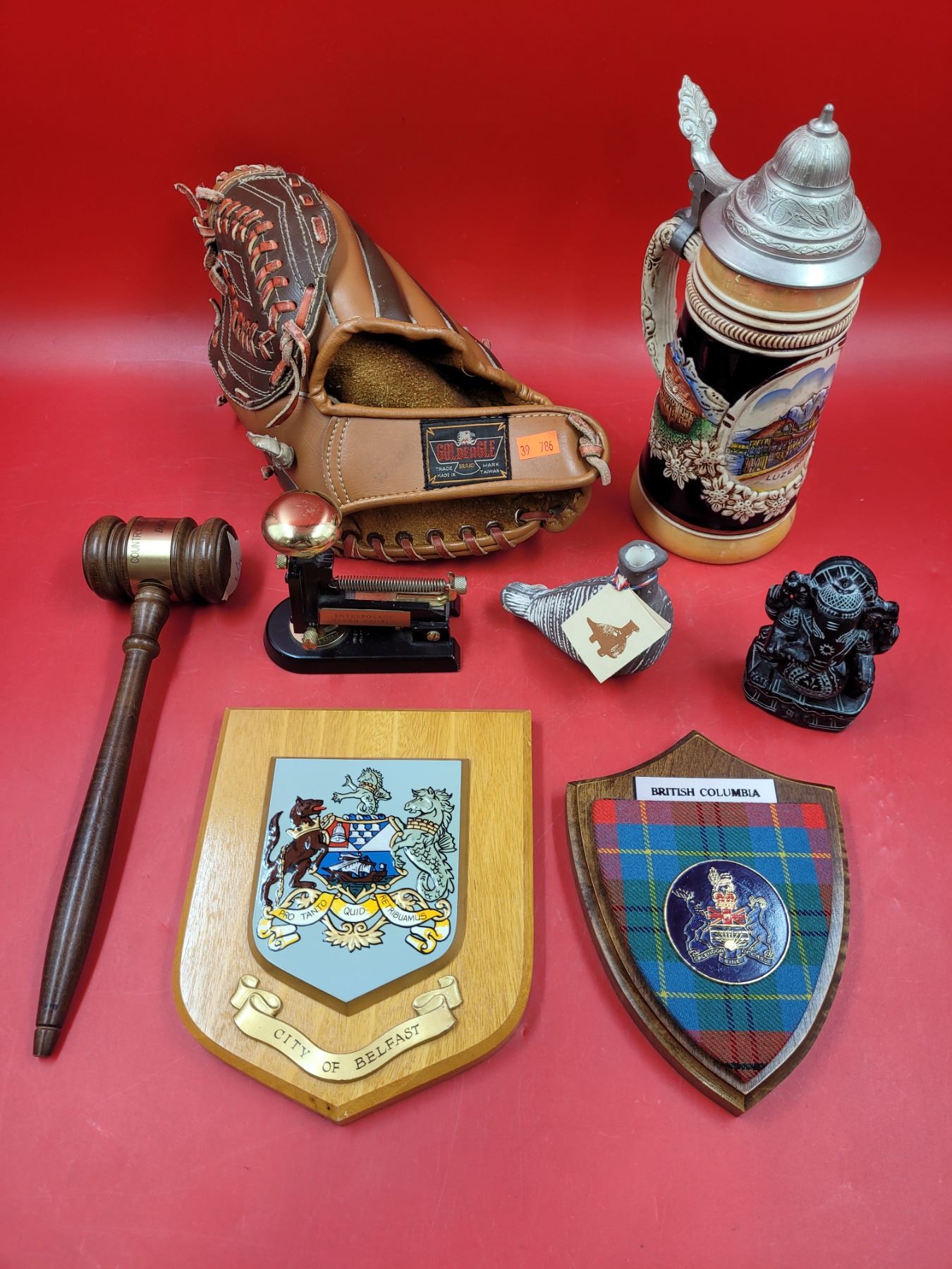 Collectibles Lot w/ 2 Coat of Arms Plaques, Soapstone Ganesha Carving, Golden Eagle Mitt, & More
