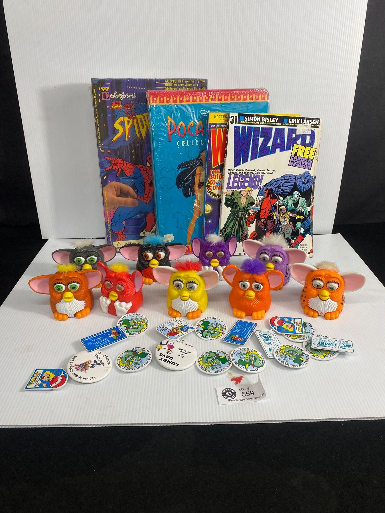 Collection Of McDonald's Furby Toys, 2 Wizard Magazines, Sealed Spiderman Adventure Set, etc