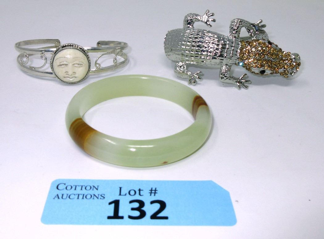 Carved jade bangle, custom made gemstone "moon face" bangle & Swarovski crystal alligator.