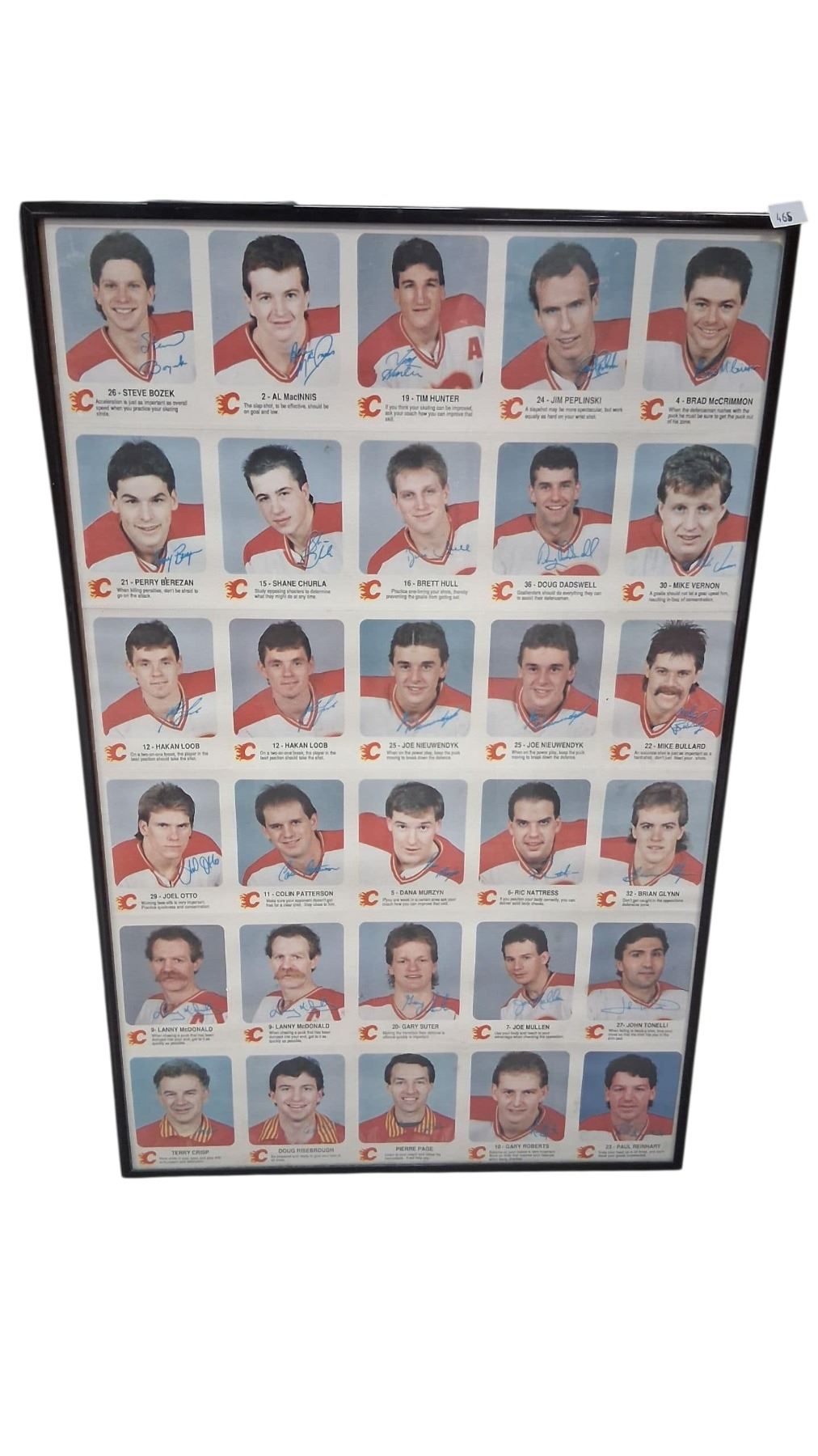 Collection of uncut hockey cards, 80s Calgary Flames, framed 22"x13"