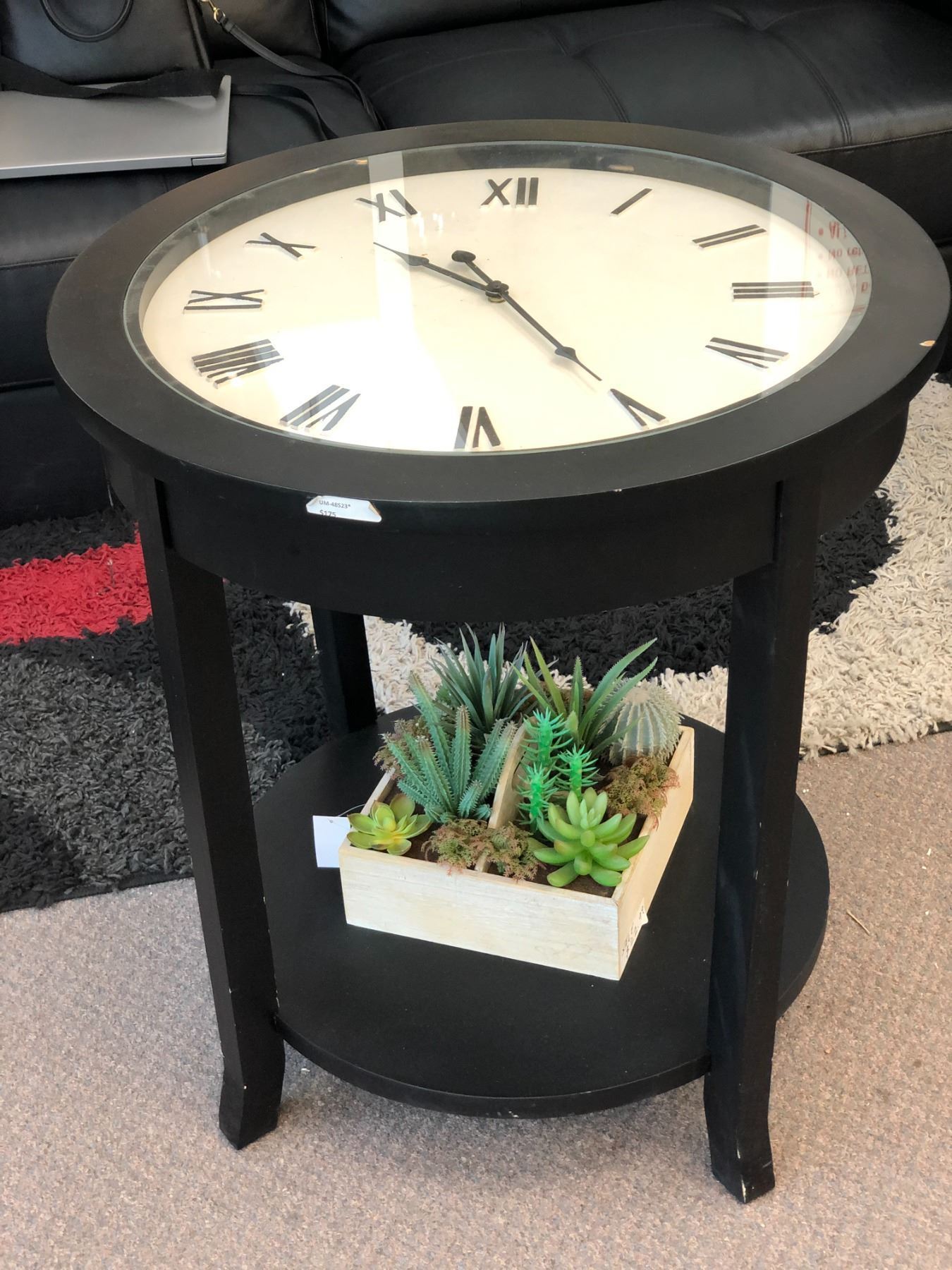 Contemporary side table w/ clock top - approx. 2ft diameter x 26in tall