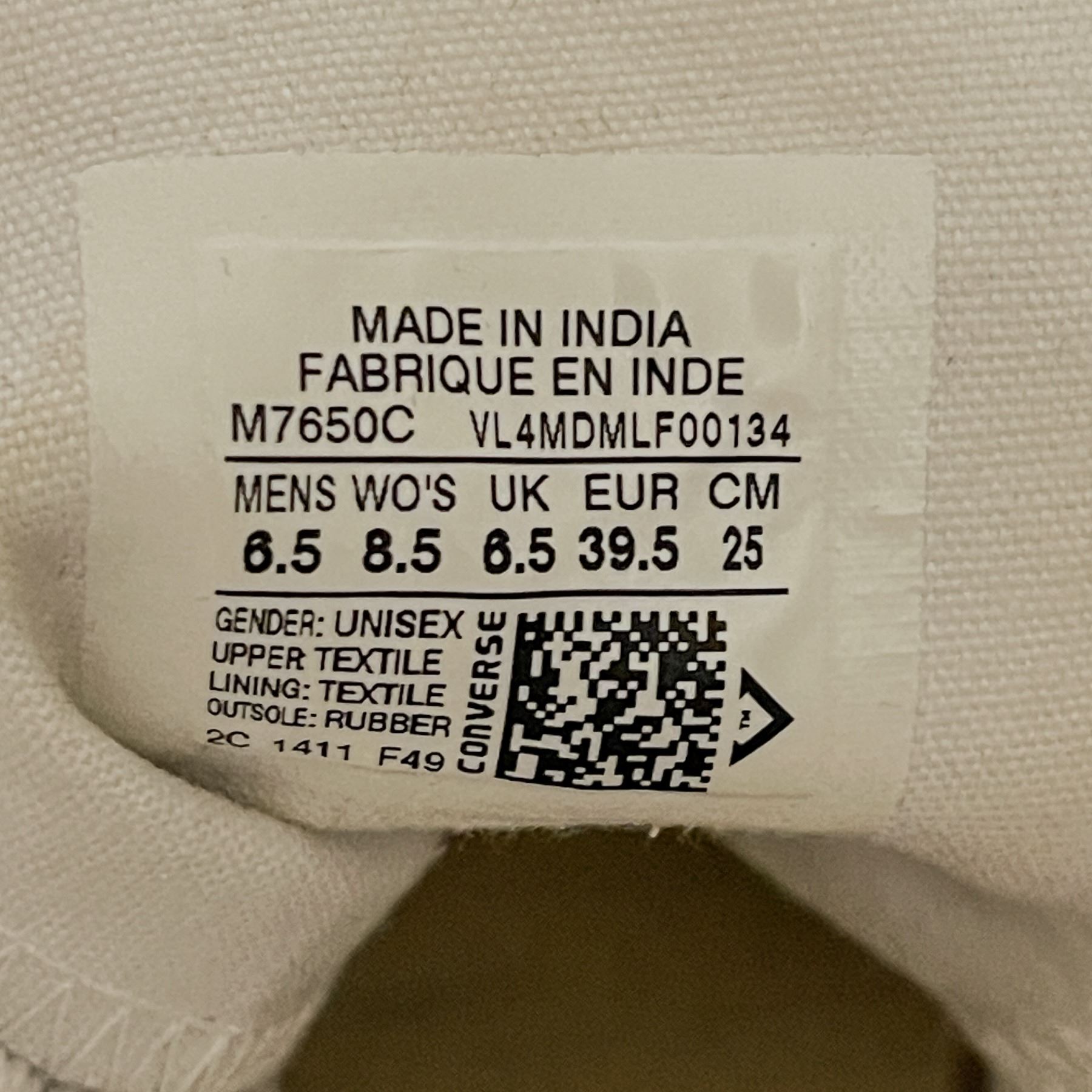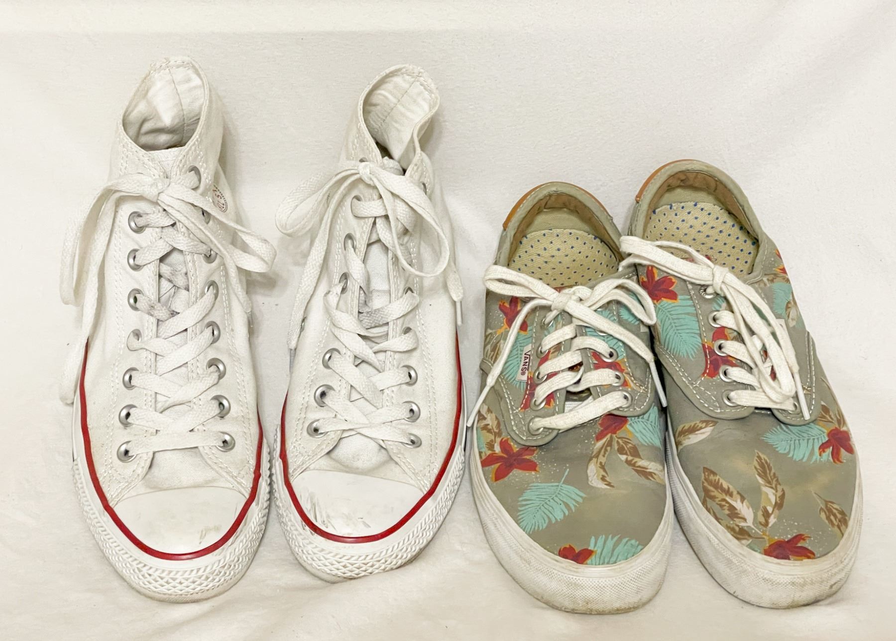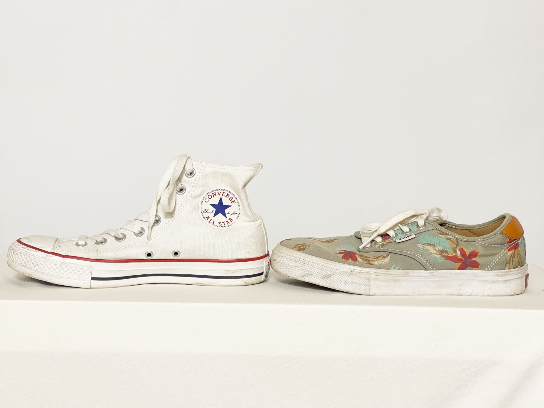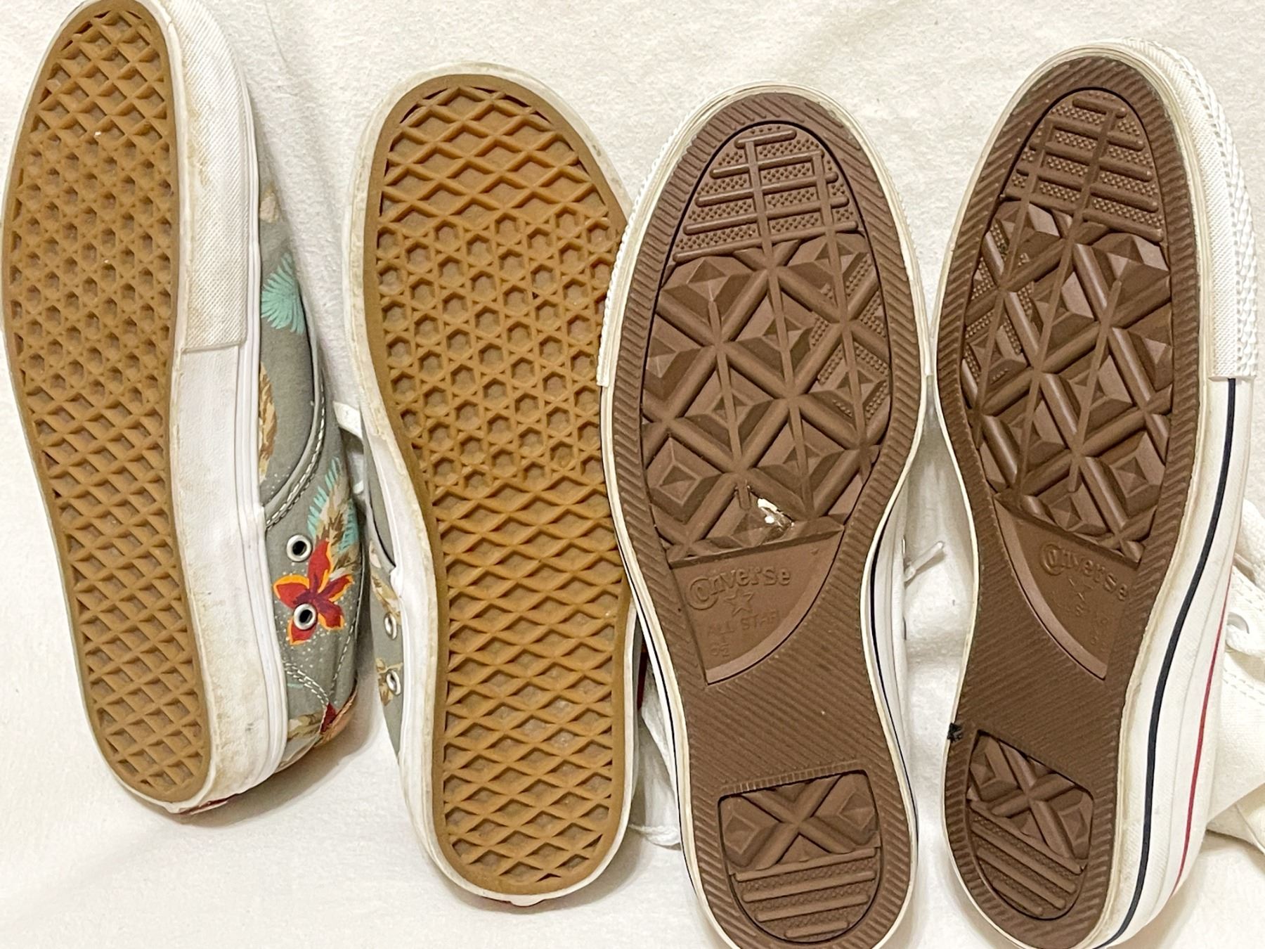 Converse classic white high-tops (Men’s 6.5/Women’s 8.5) and Vans tropical print lace-up sneakers (Men’s 7/Women’s 9), both in good condition.