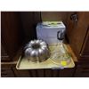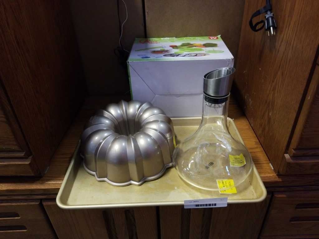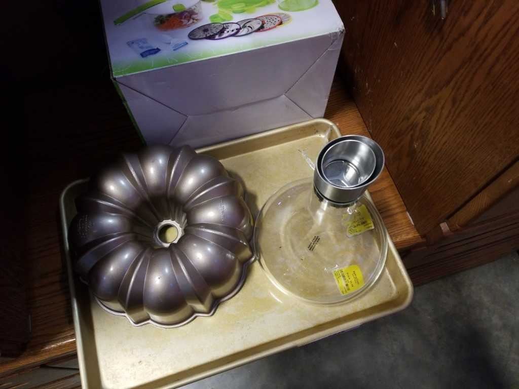 Cookie sheet, wine decanter/aerator, rotochamp and cake pan