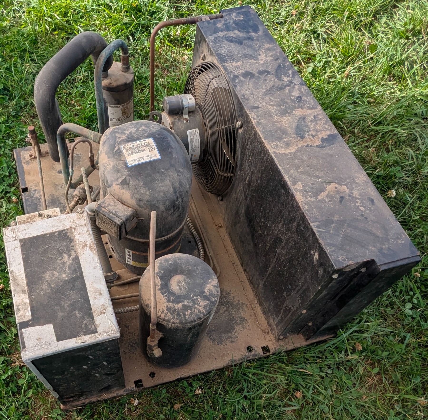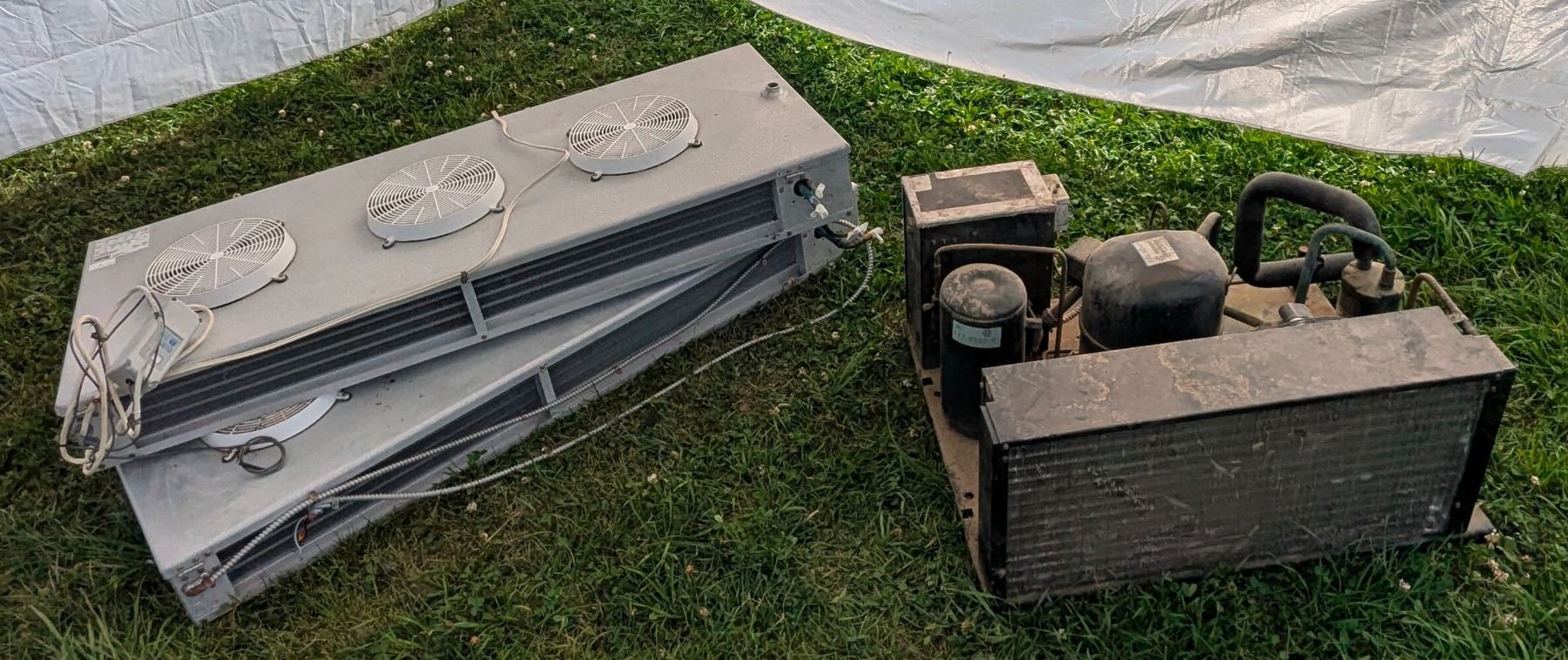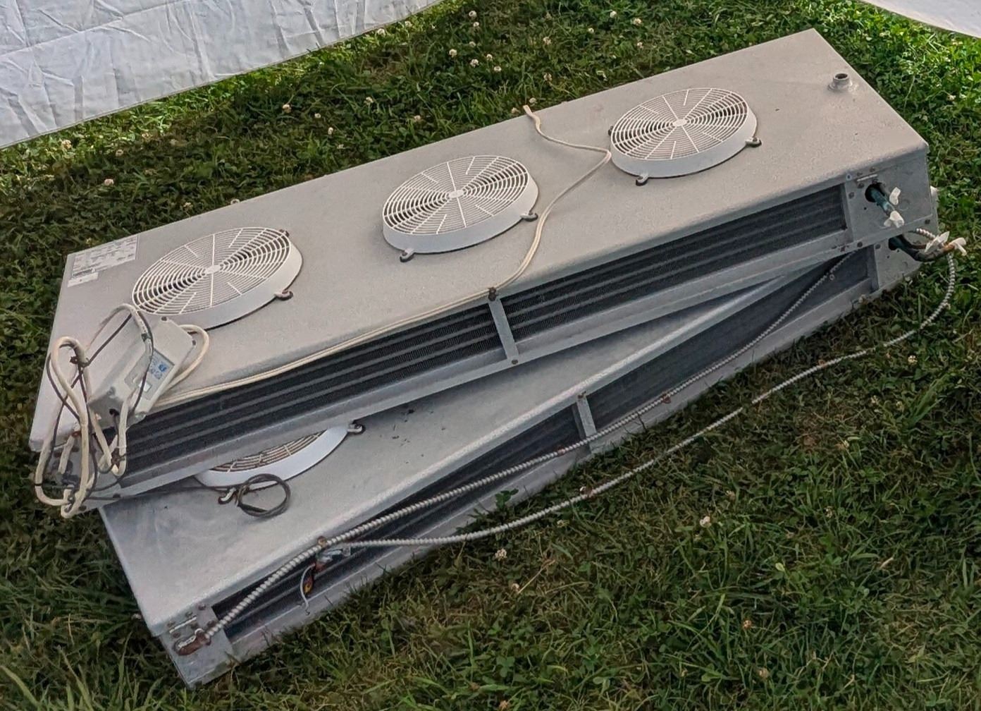 Cooler unit designed for a walk-in fridge application. comes with large condenser, two separate evaporators that work in tandem, and a thermostat.