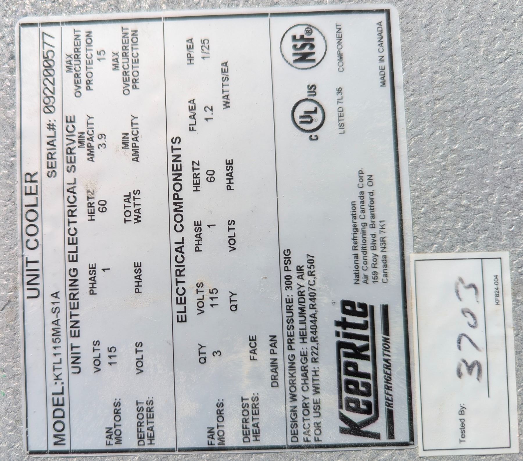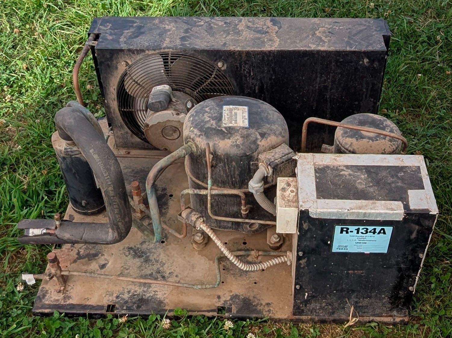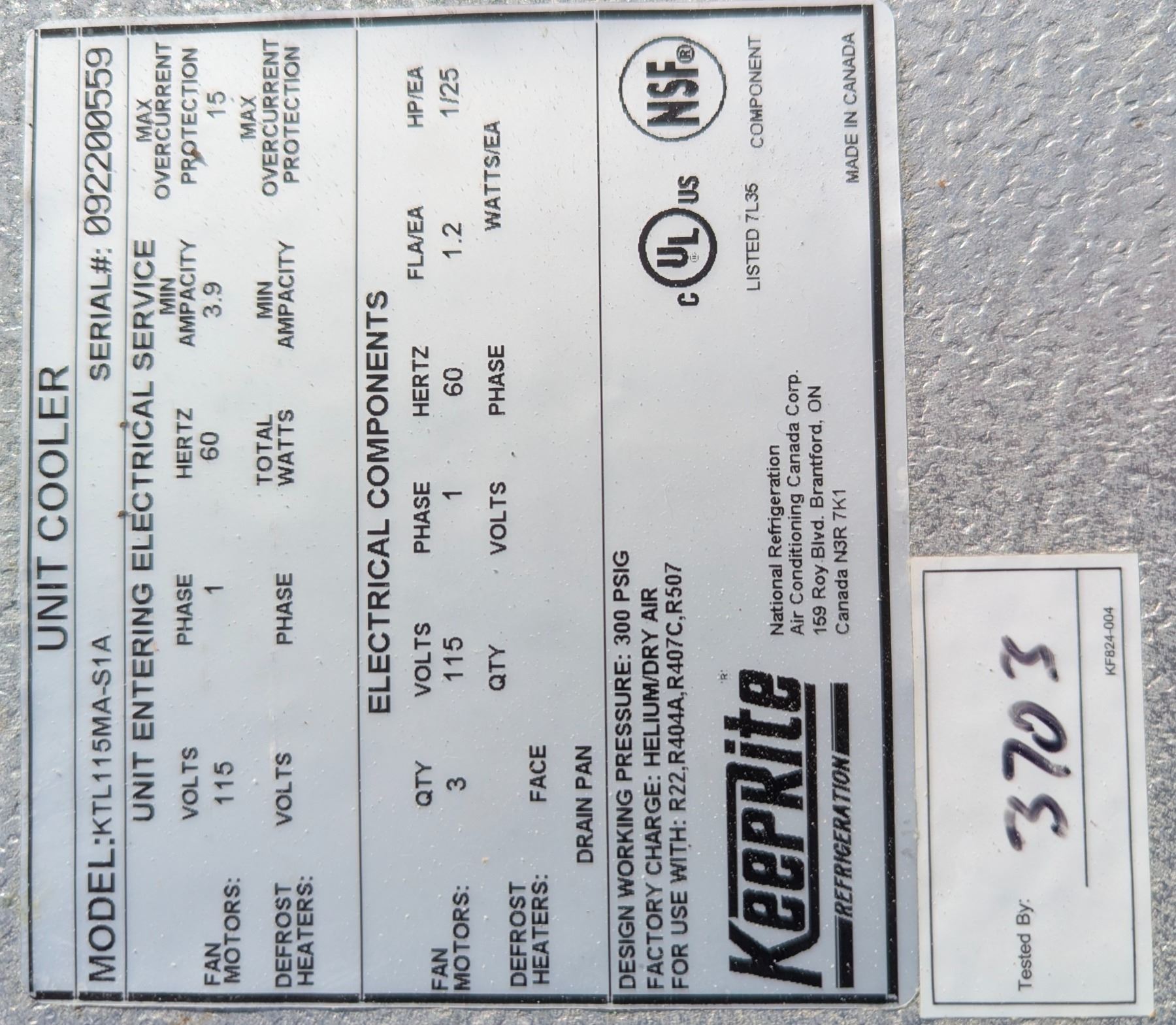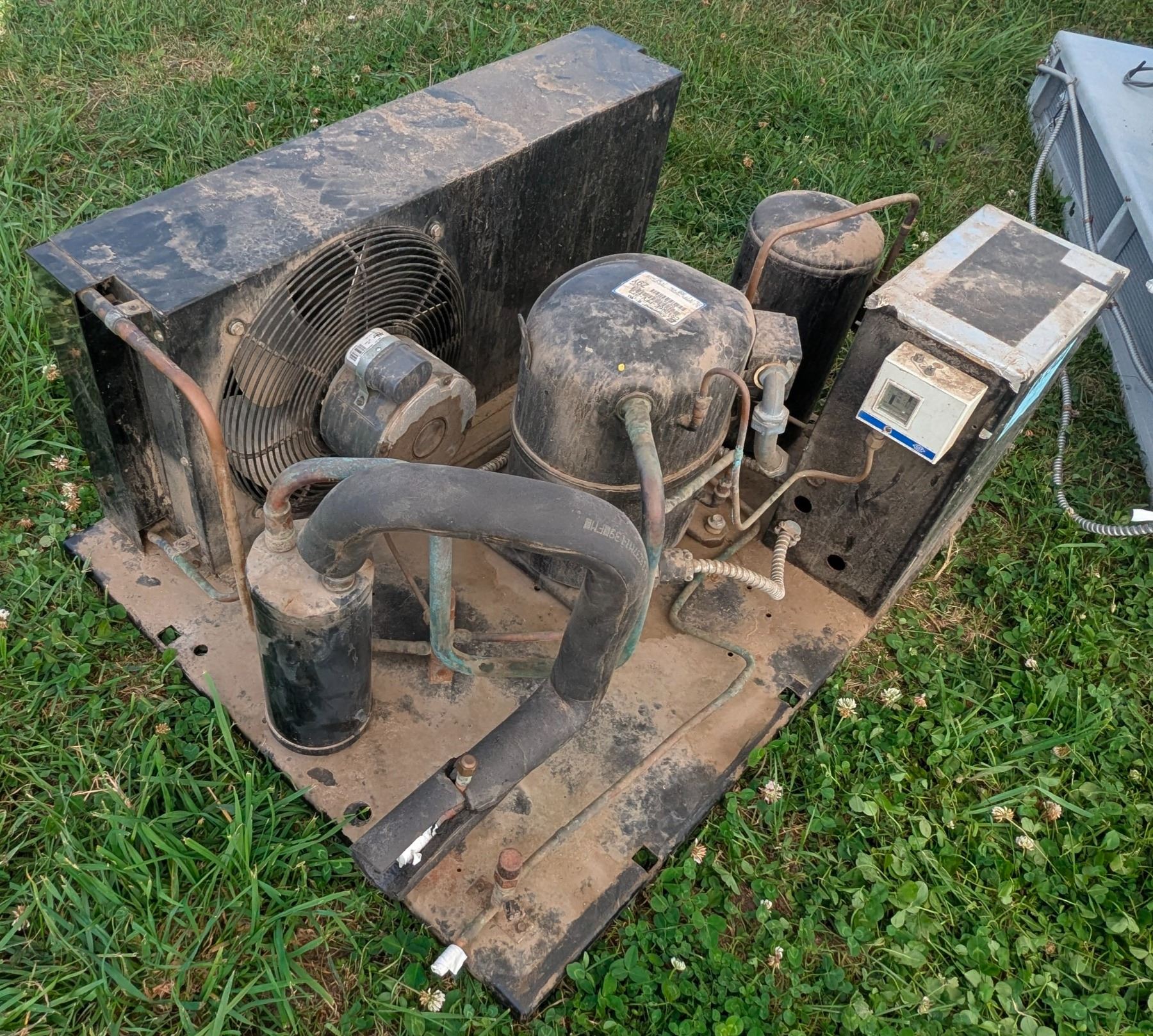 Cooler unit designed for a walk-in fridge application. comes with large condenser, two separate evaporators that work in tandem, and a thermostat.