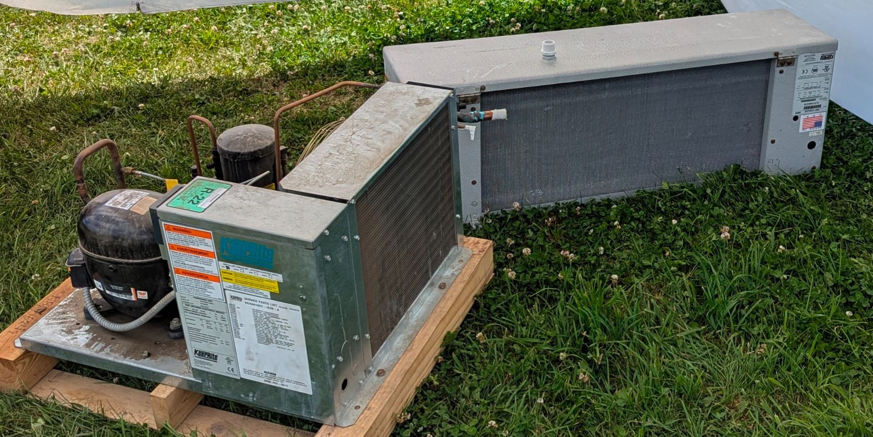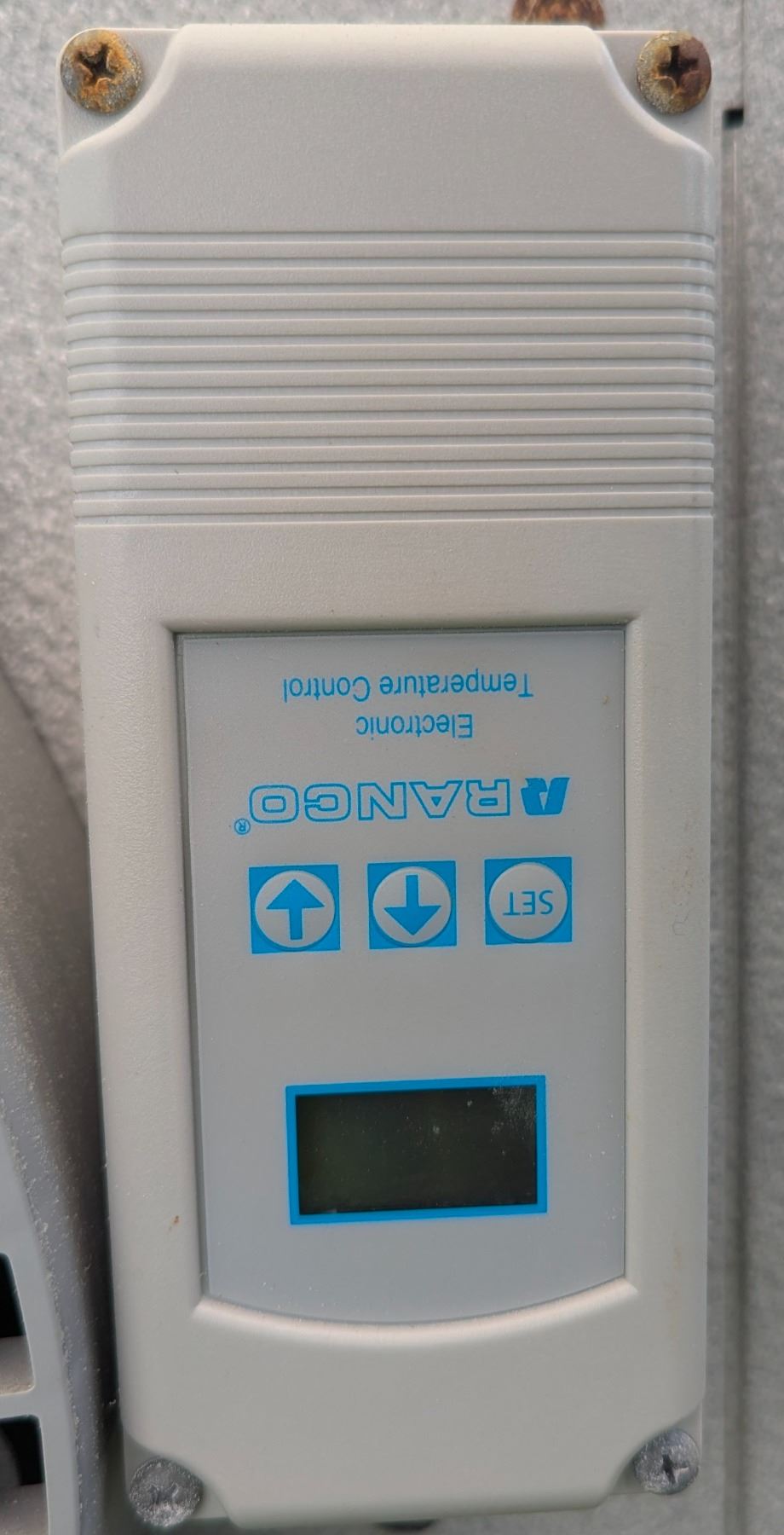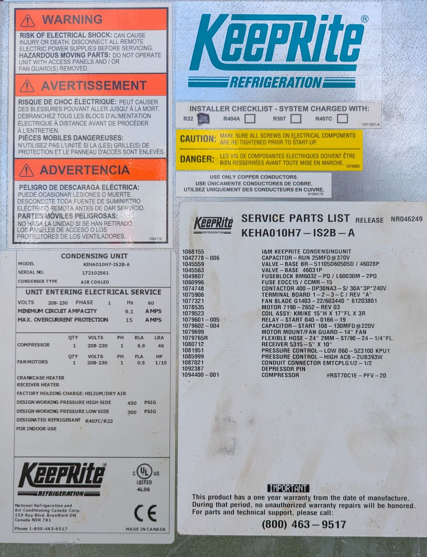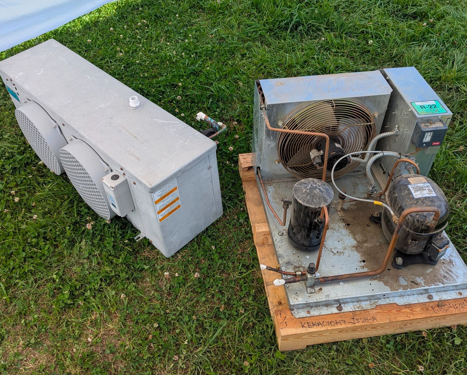 Cooler unit designed for a walk-in fridge application. comes with condenser, evaporator, and thermostat.