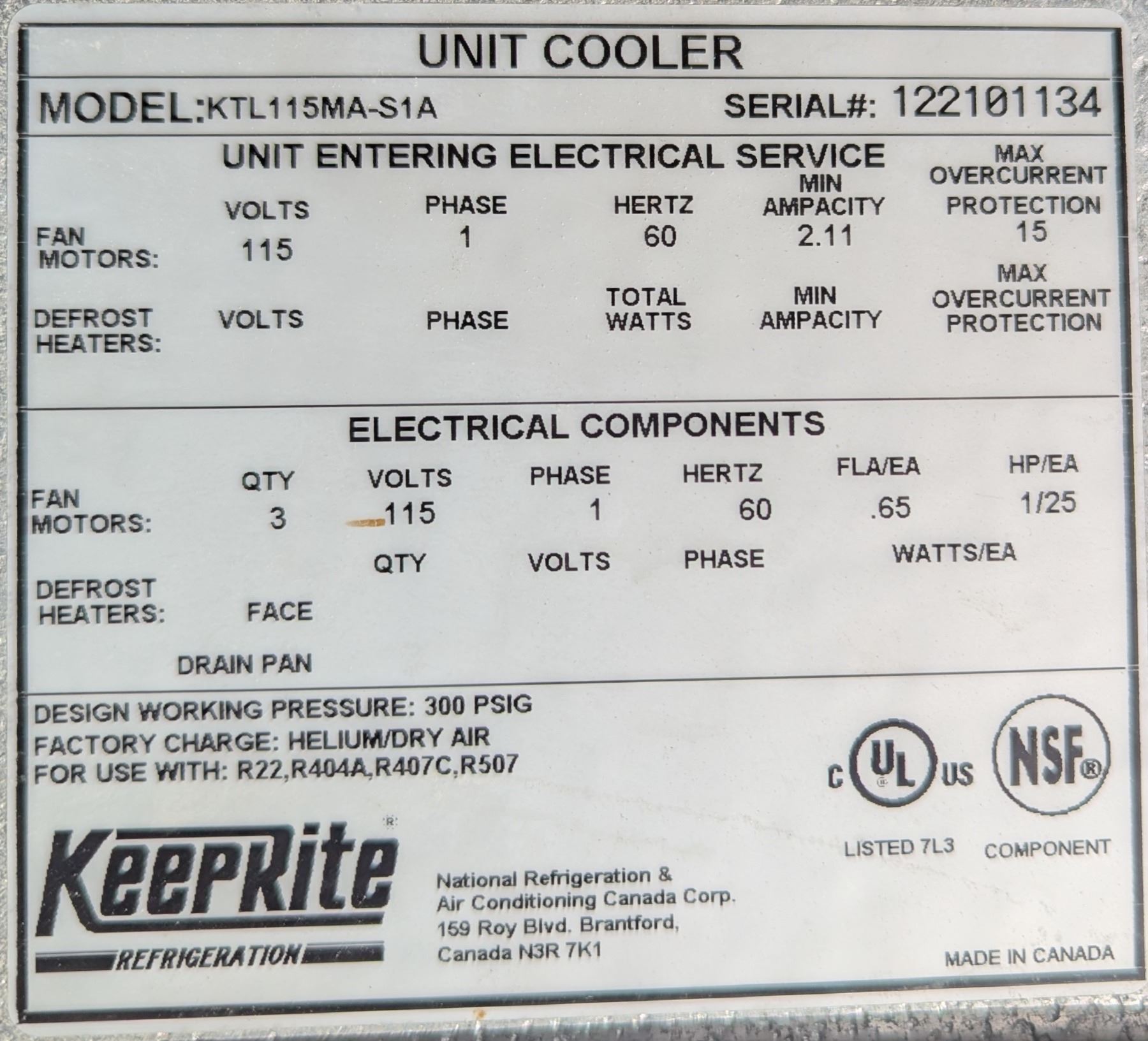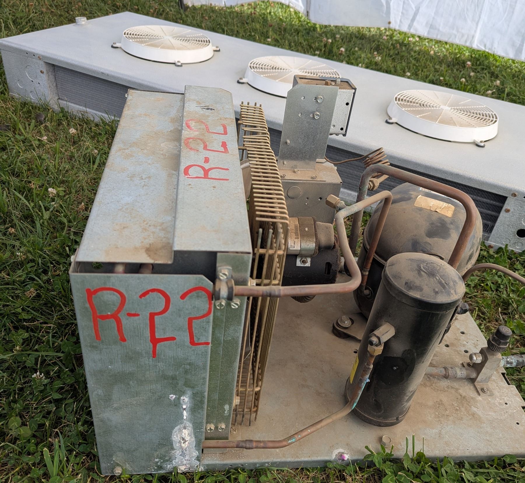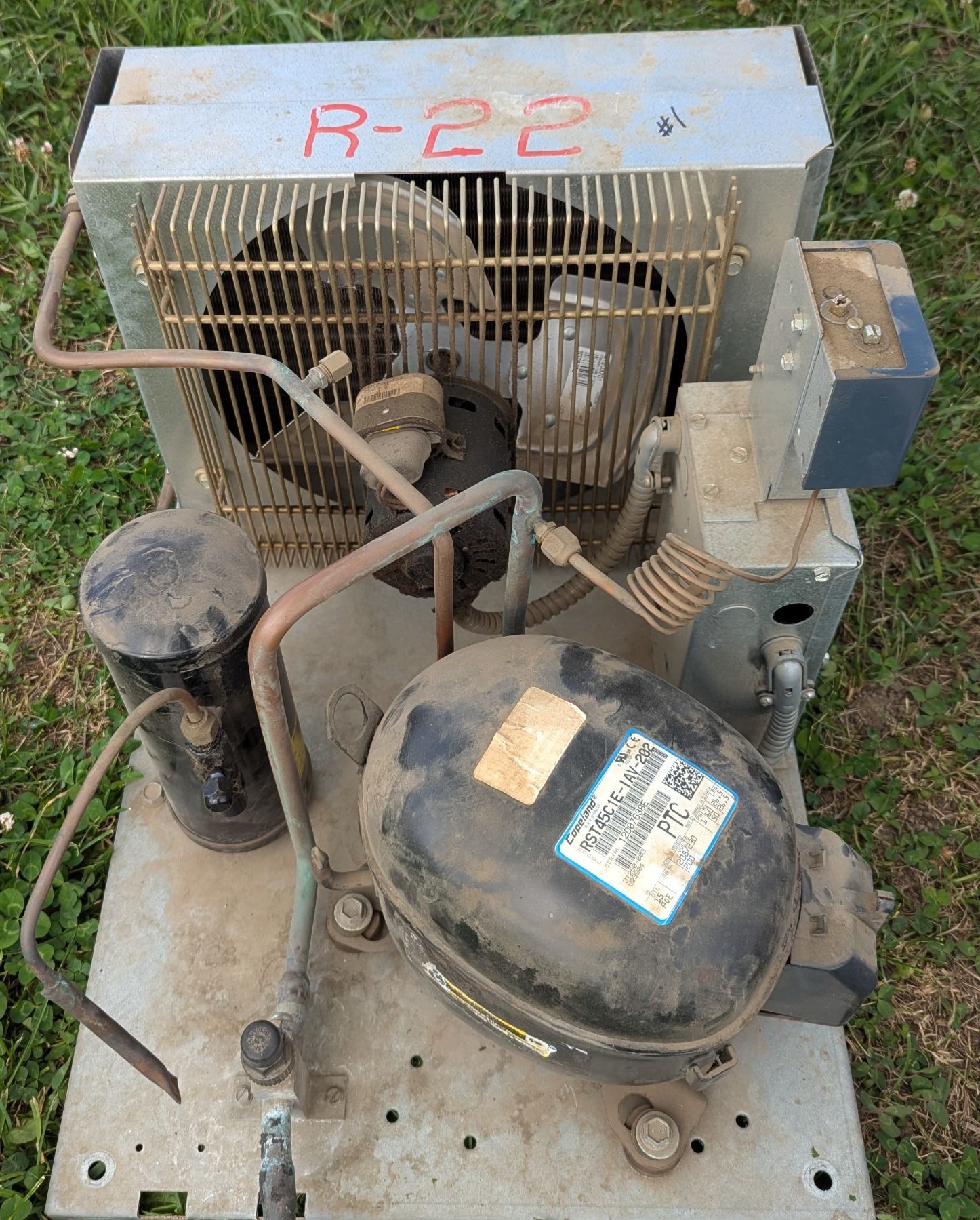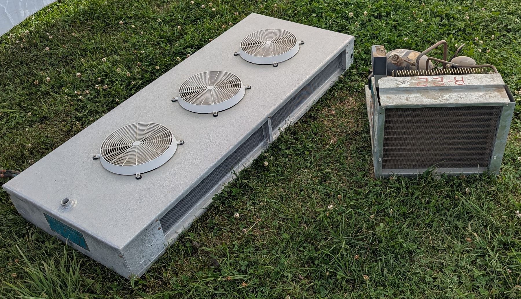Cooler unit designed for a walk-in fridge application. comes with condenser, evaporator, and thermostat.