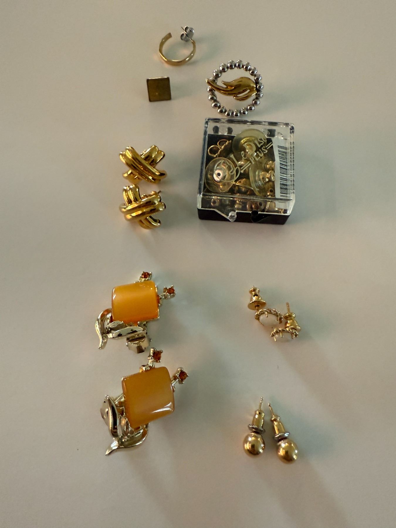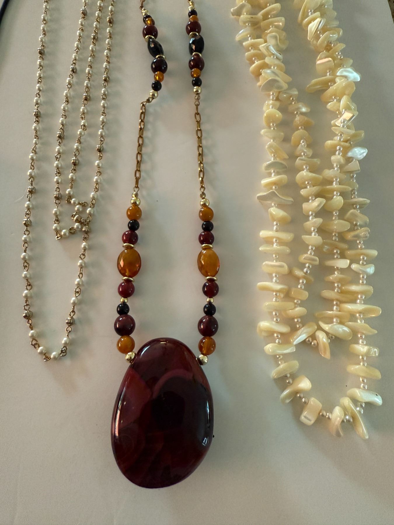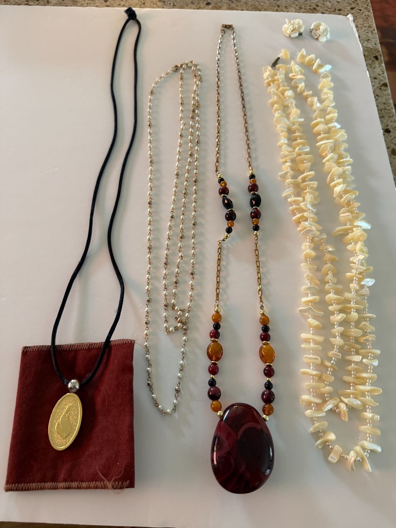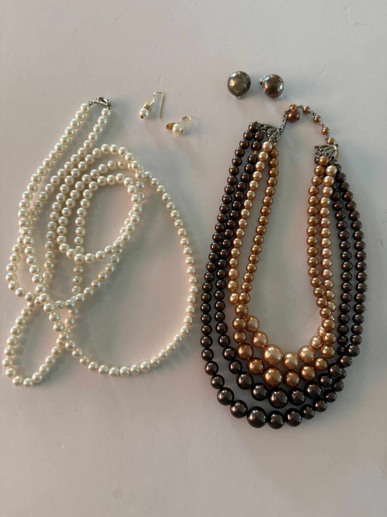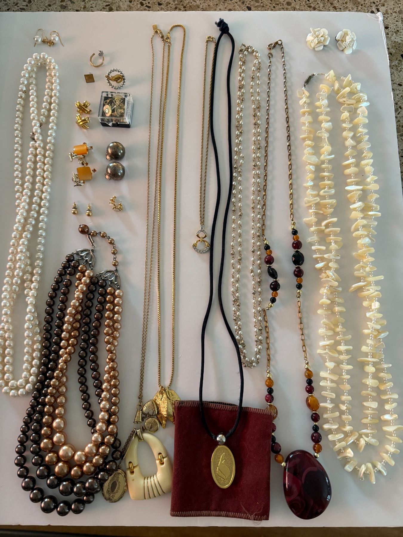 Costume Jewelry A: Necklaces (shell, beads, pearls, more), earrings and extra backings, missing back of one clip-on. 3 single pierced earrings.