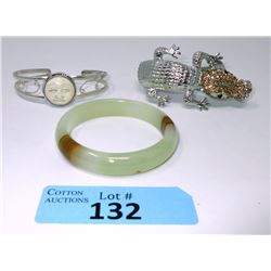 Carved jade bangle, custom made gemstone "moon face" bangle & Swarovski crystal alligator.