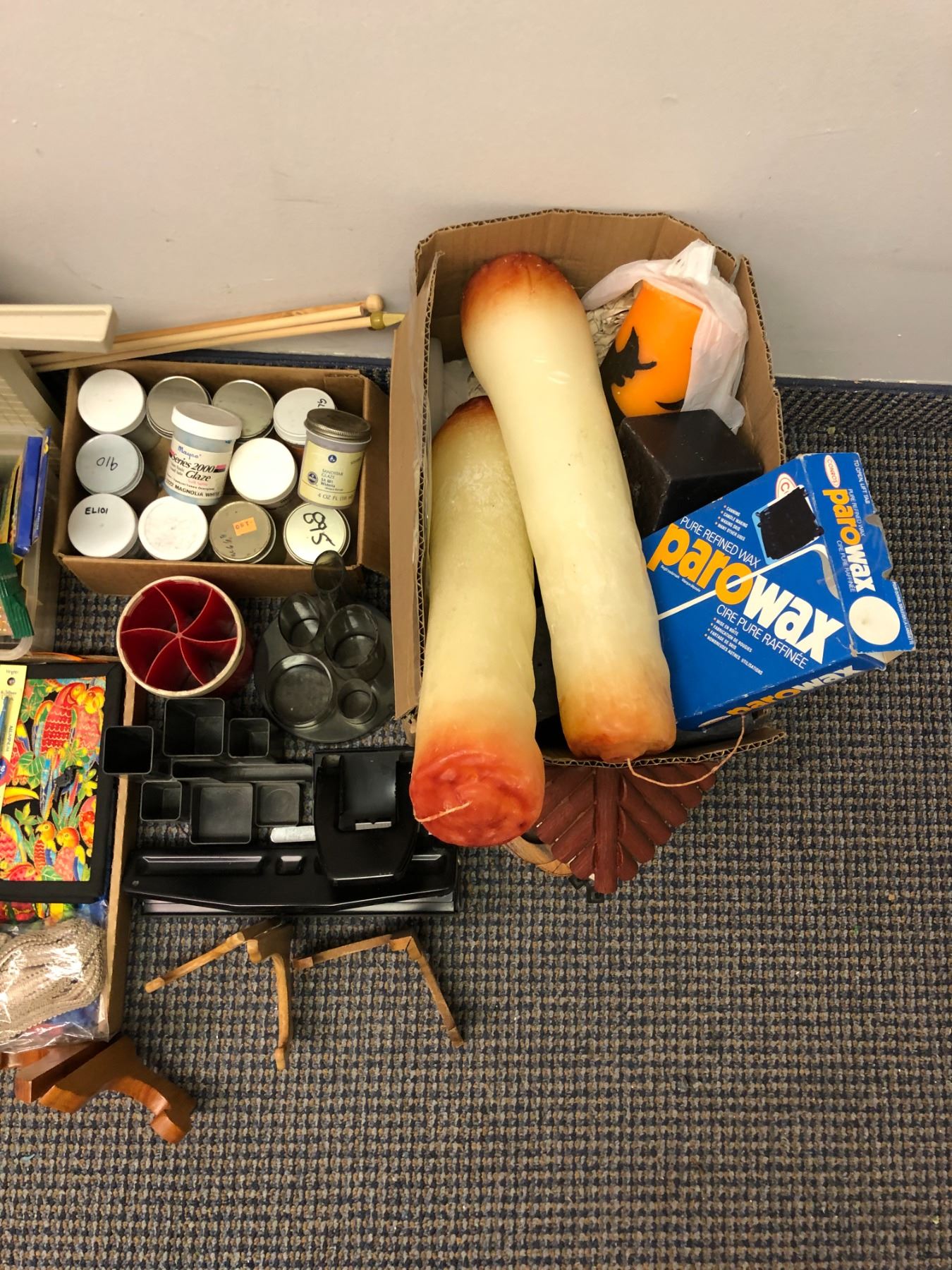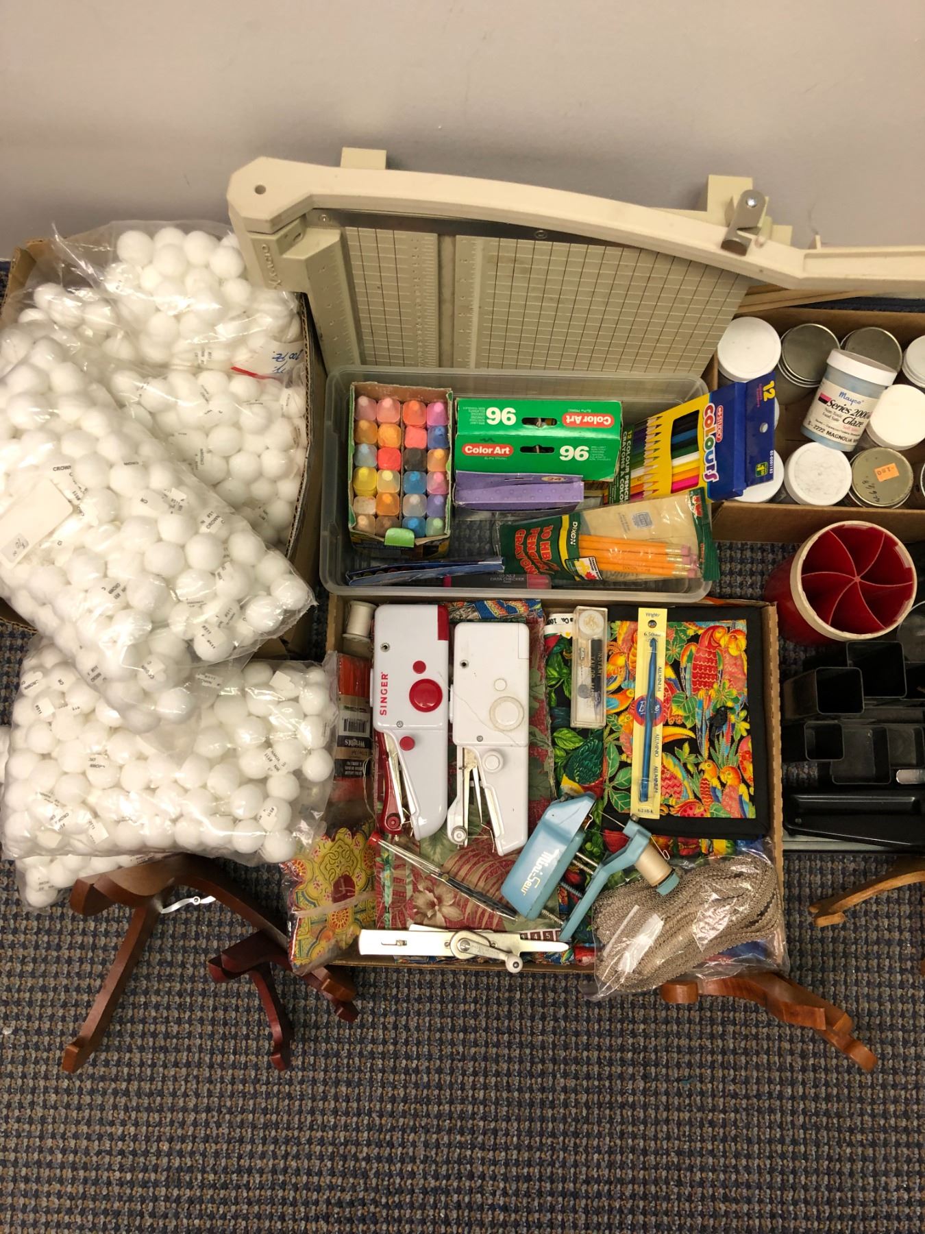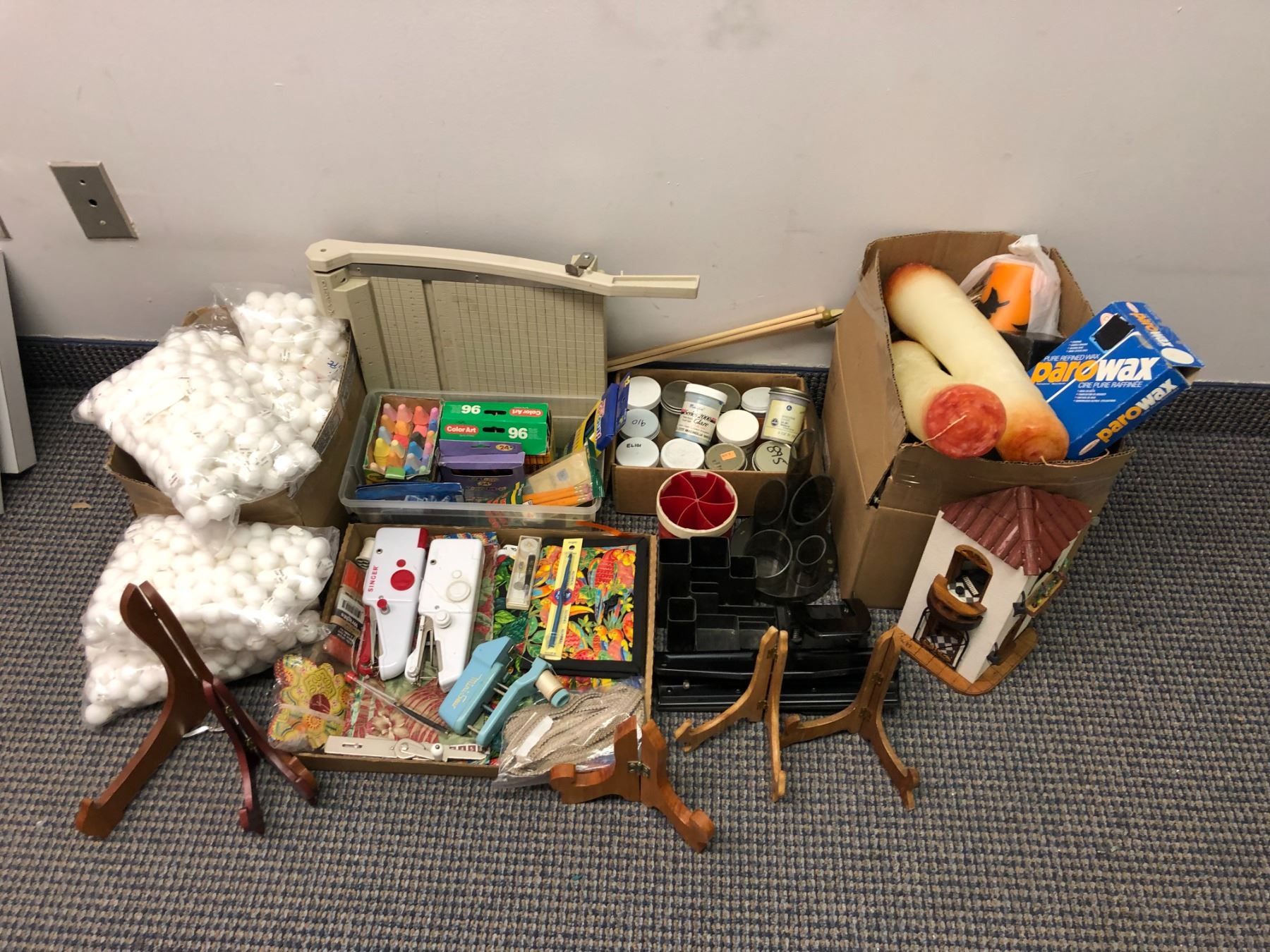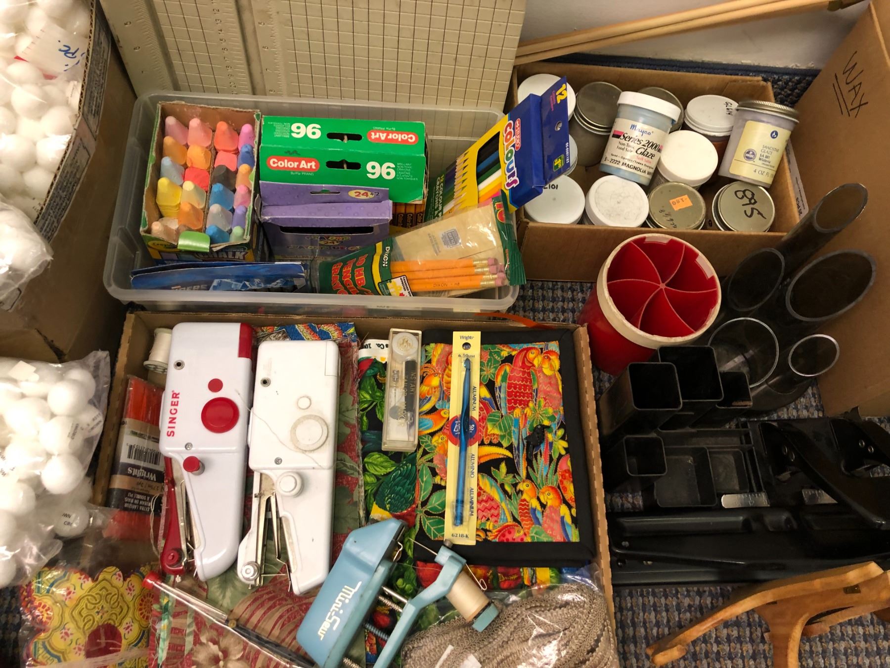 Crafting lot - paper cutter/ wax/ candles/ ceramic paints/ hand sewing stitchers/ pom-poms/ bright f