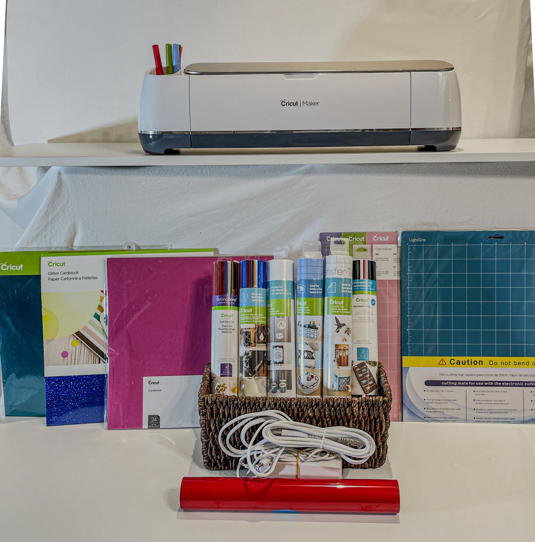 Large Cricut crafting bundle featuring a lightly used Cricut Maker machine with power cord and tools, multiple rolls of vinyl and transfer tape, glitter and cardstock paper packs, cutting mats, and pens. A complete starter or upgrade set for precision cutting, crafting, and DIY projects. Excellent condition with minimal use.