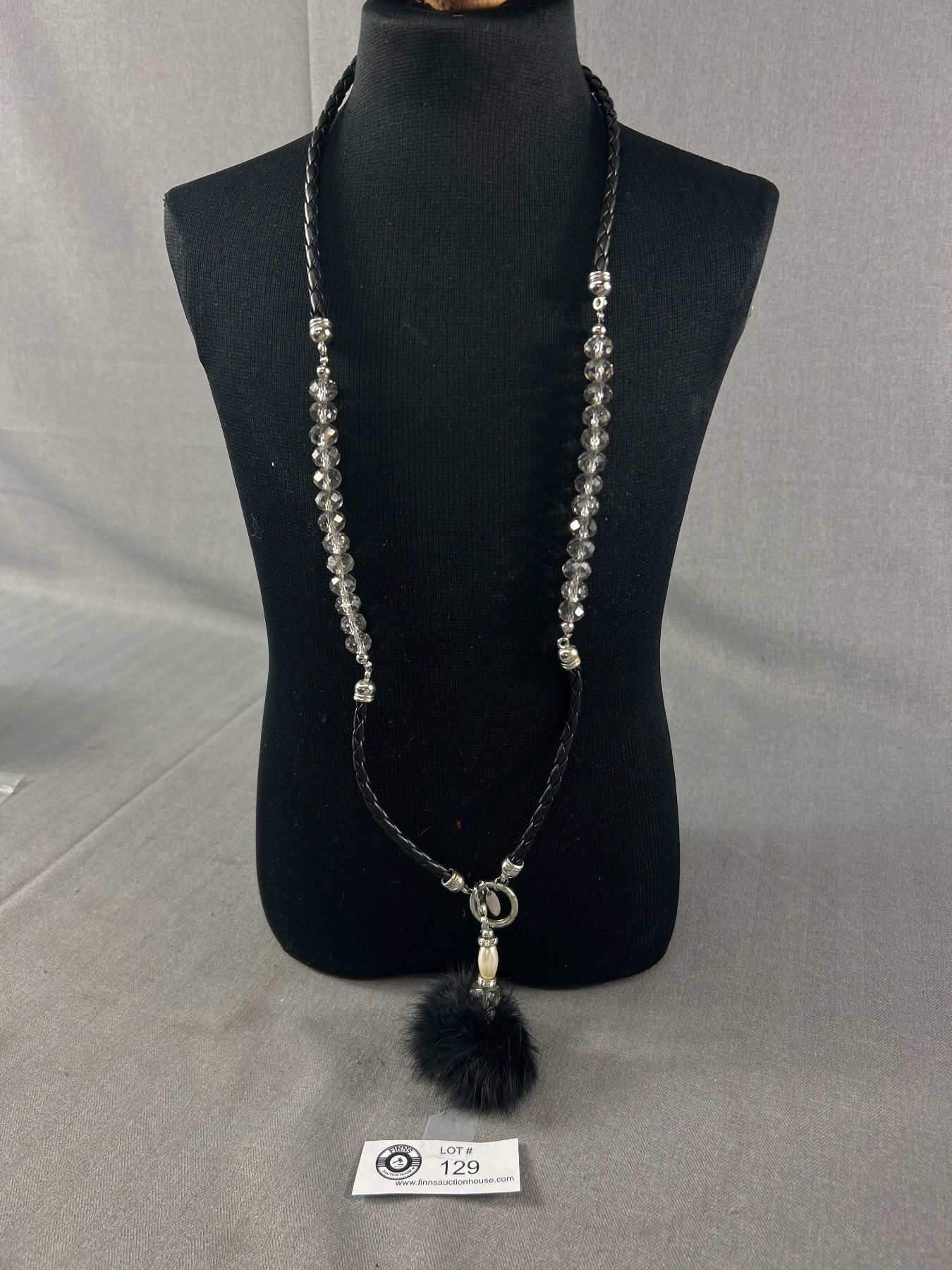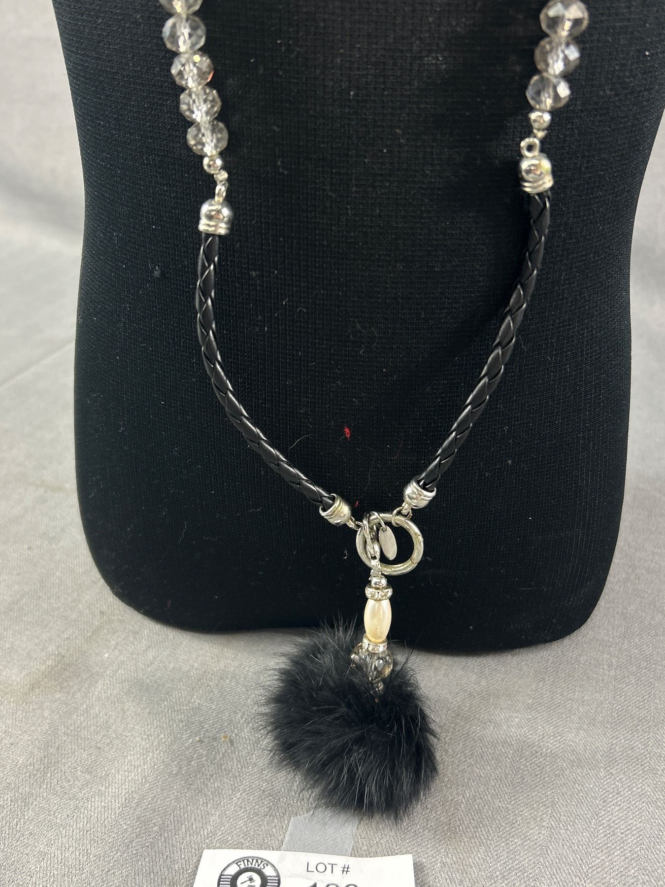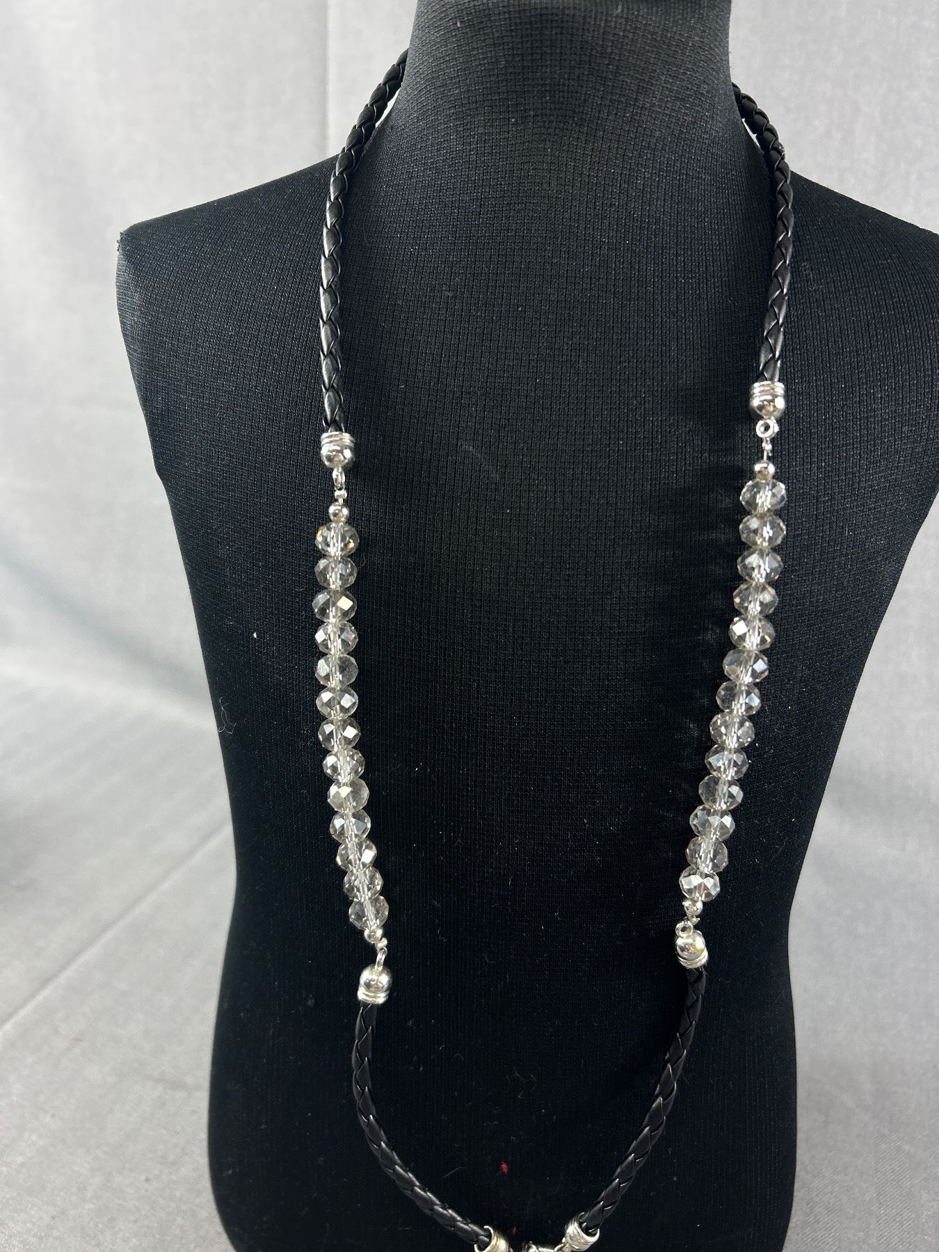Crystal Beads & Black Leather Cord Necklace, Marked Kim & Co.