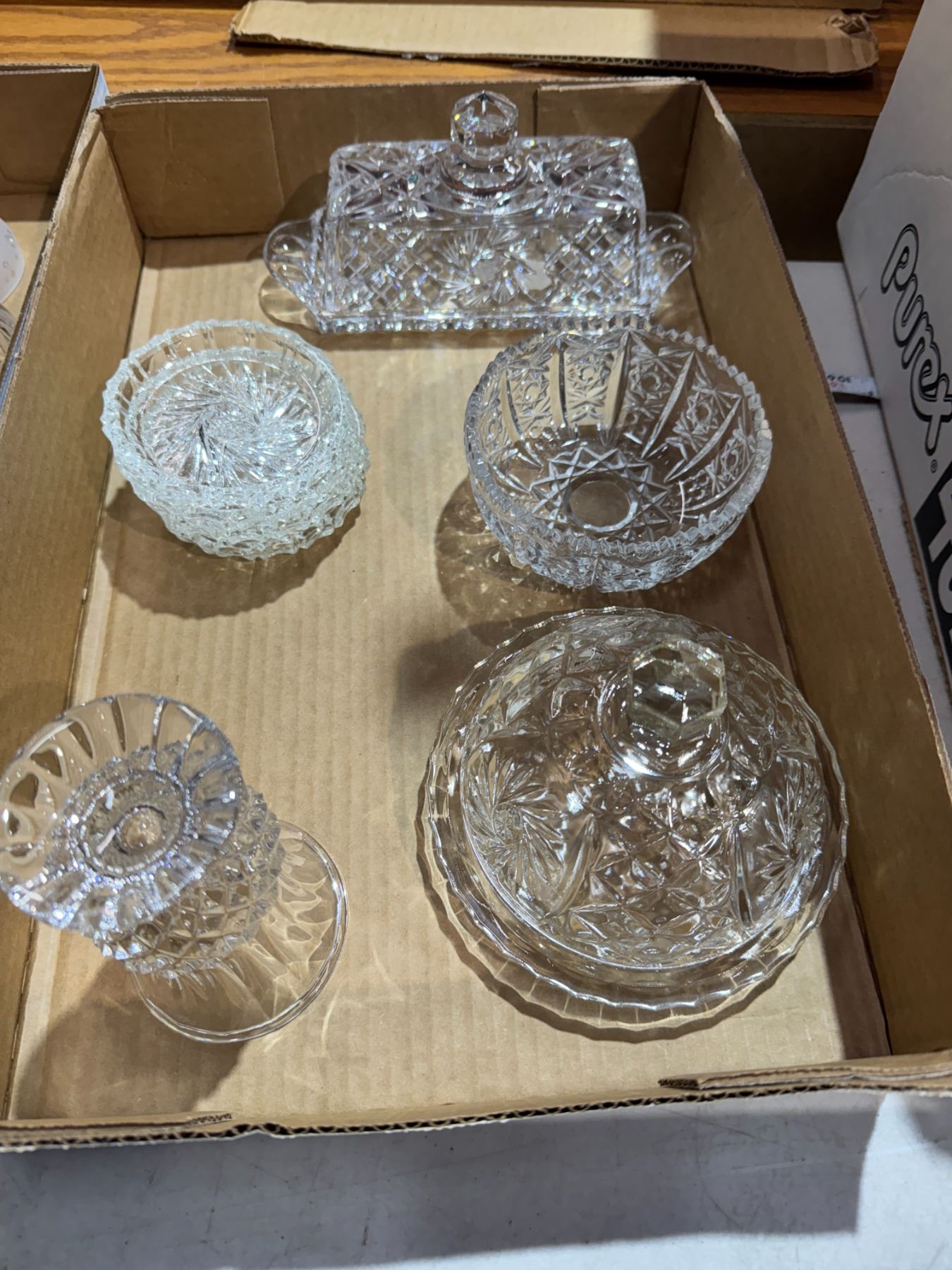 Crystal coasters, butter, dishes, etc.