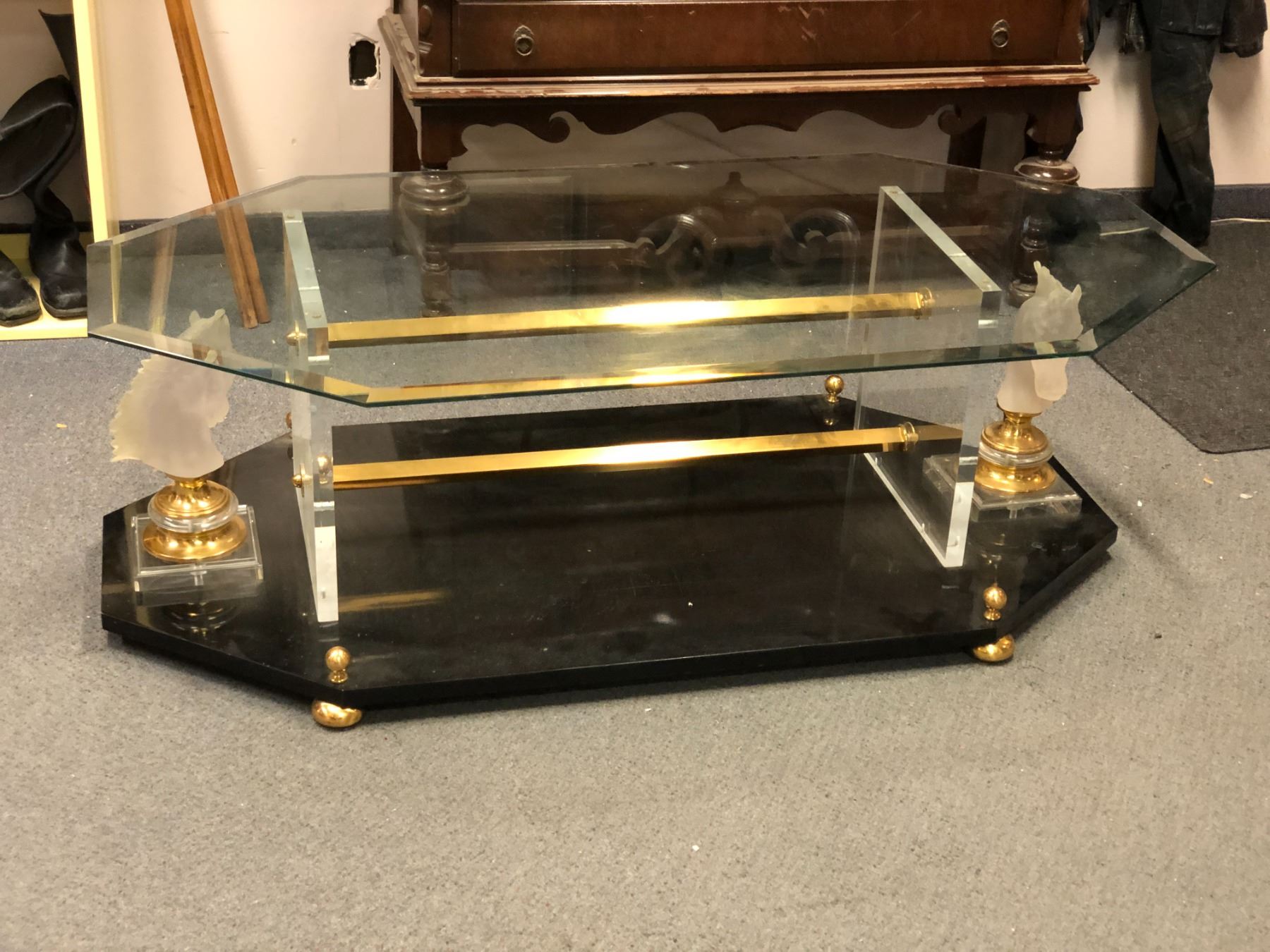 Custom built glasstop coffee table w/ plexiglass horse head motif (From the horror drama show)