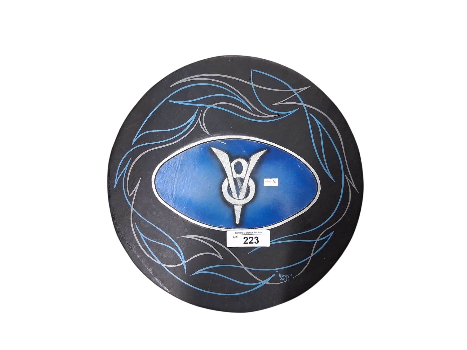 Custom hand painted on leather Ford V8 pinstripe sign 15" diameter