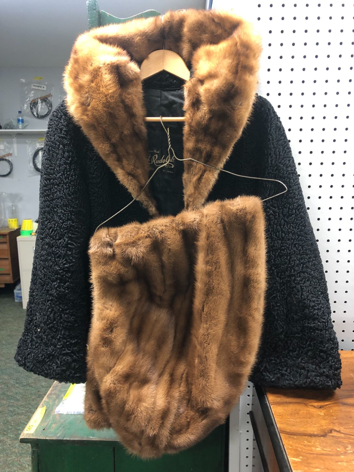 Custom made H. Rudolph black wool coat w/ fur-lined collar & fur shawl (2 pc set from movie set)