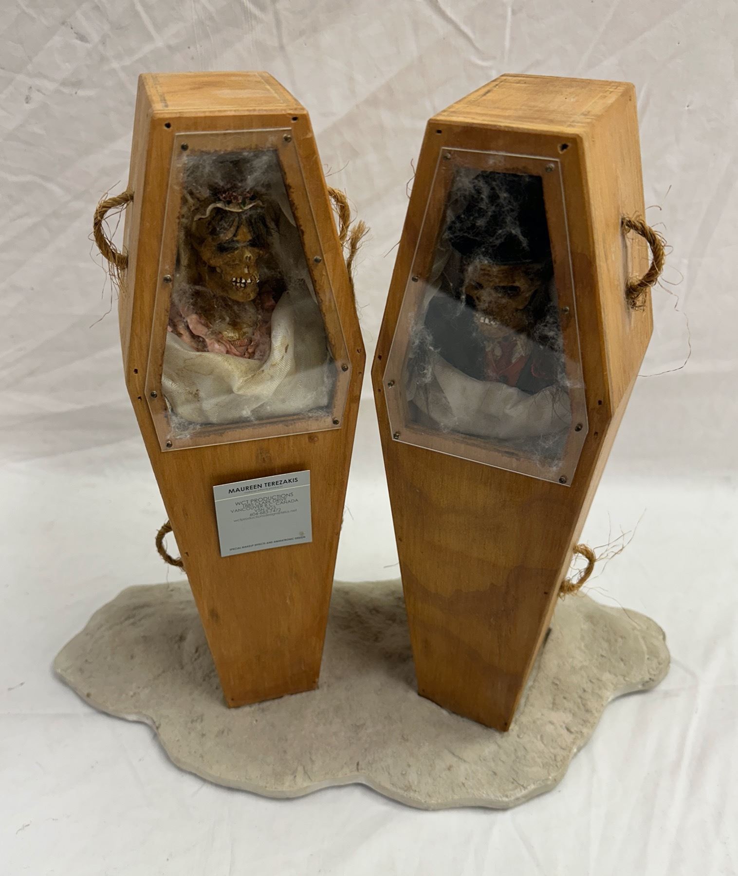 Custom-made decorative coffins w/ skeletons. Made for Bill & Maureen Terezakis (approx. 14in wide x 13in tall)