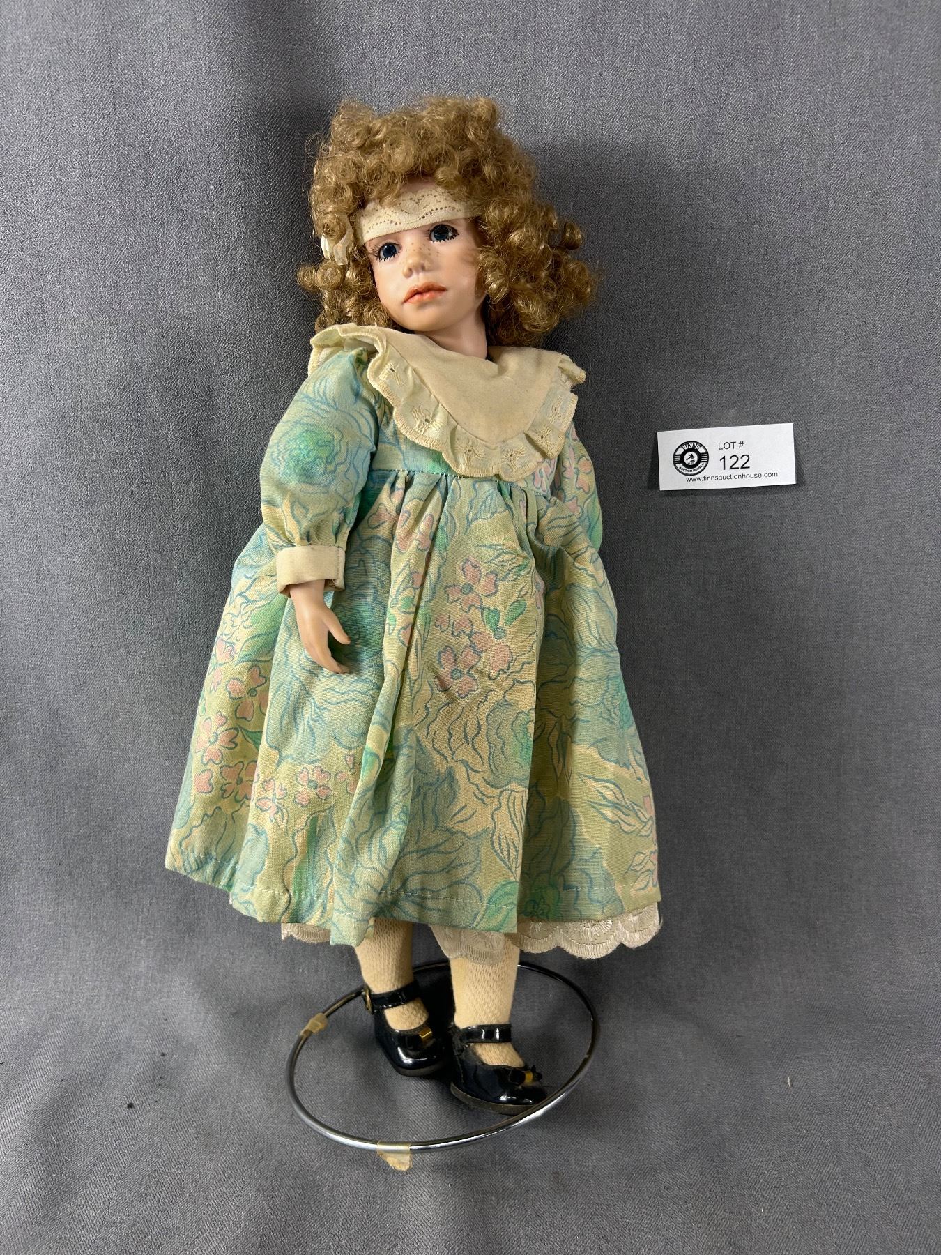 Cute Freckle Faced Vintage Seder Porecelain Doll On Stand. Approx. 16" H