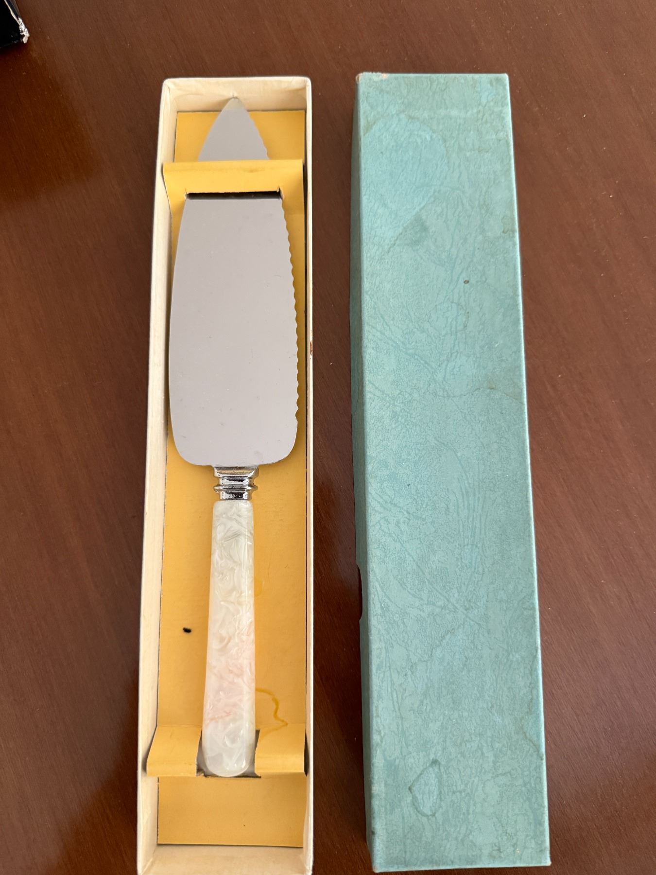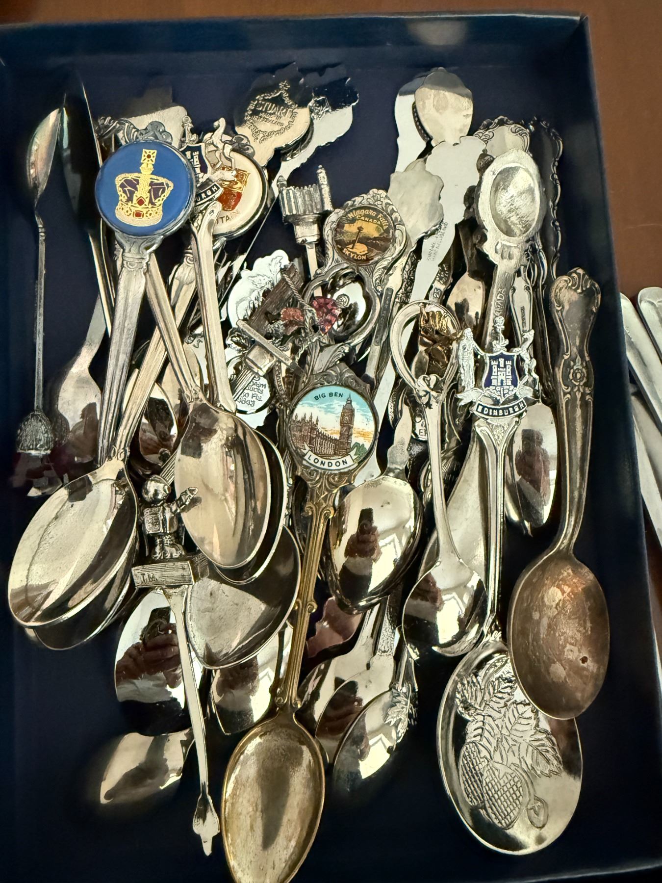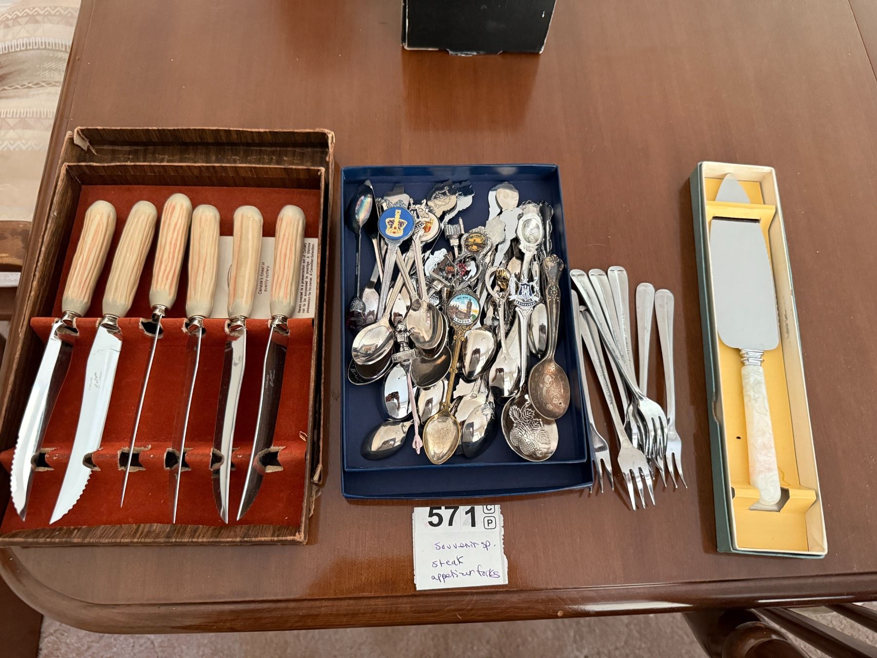 Cutron cutters, silverplate and other souvenir spoons, appie forks, cake server.