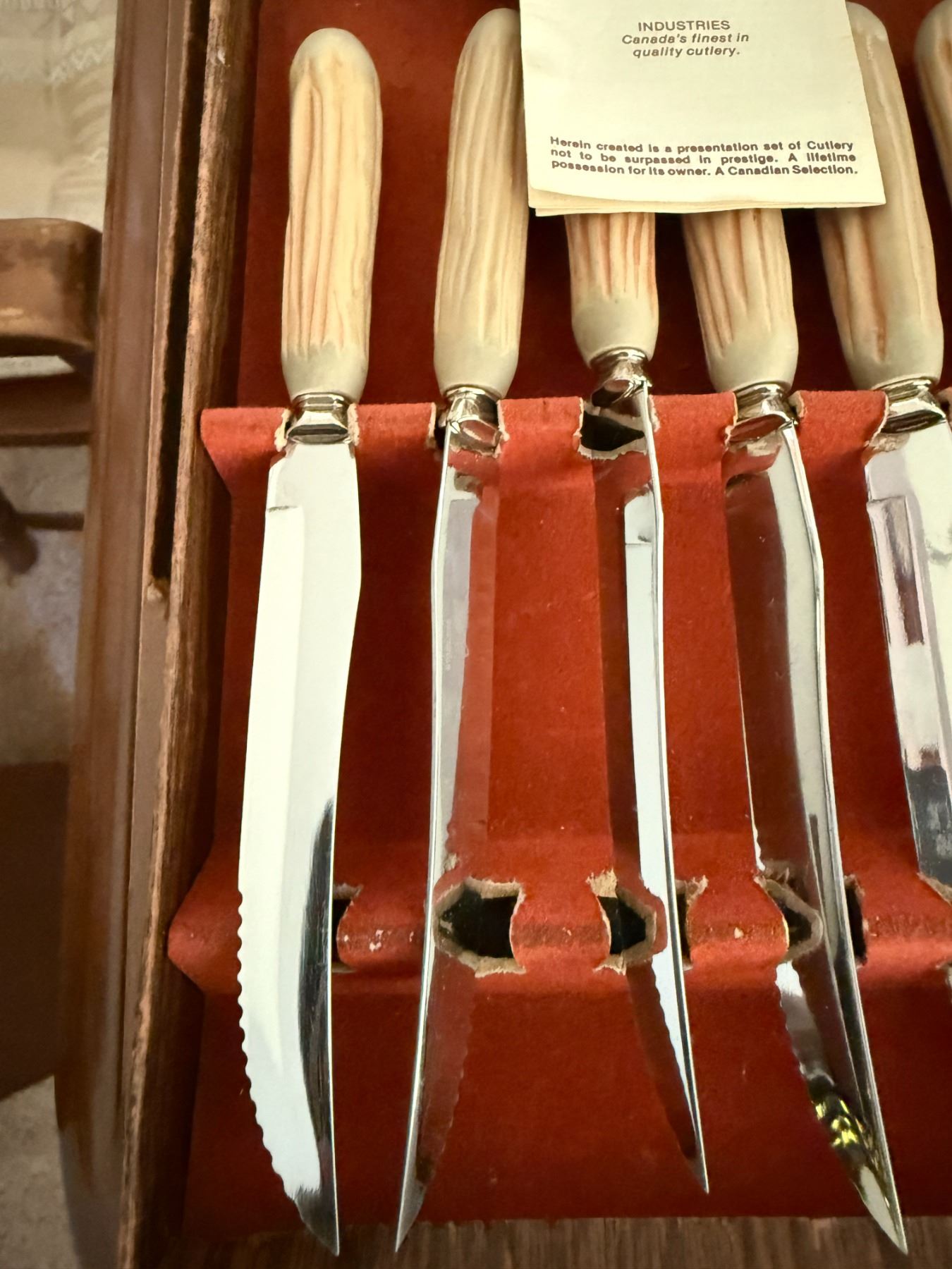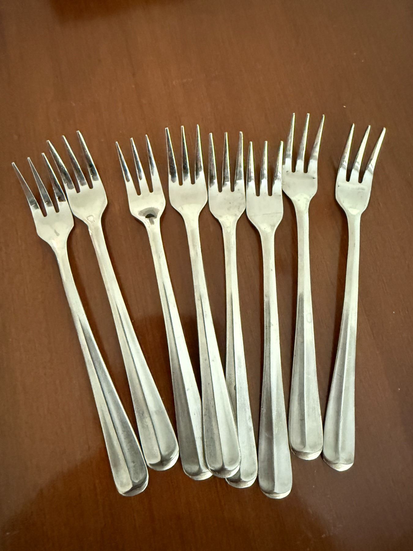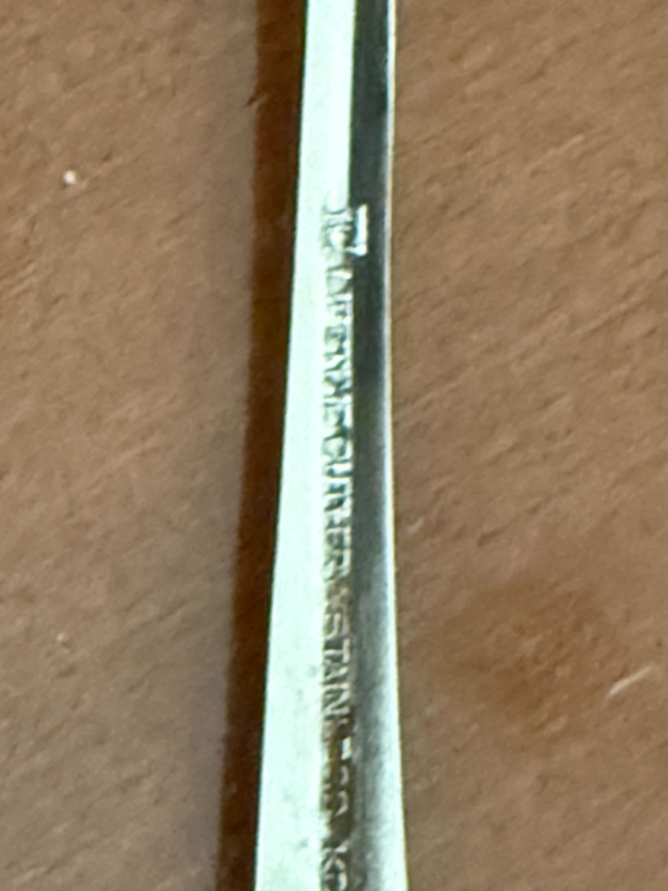 Cutron cutters, silverplate and other souvenir spoons, appie forks, cake server.