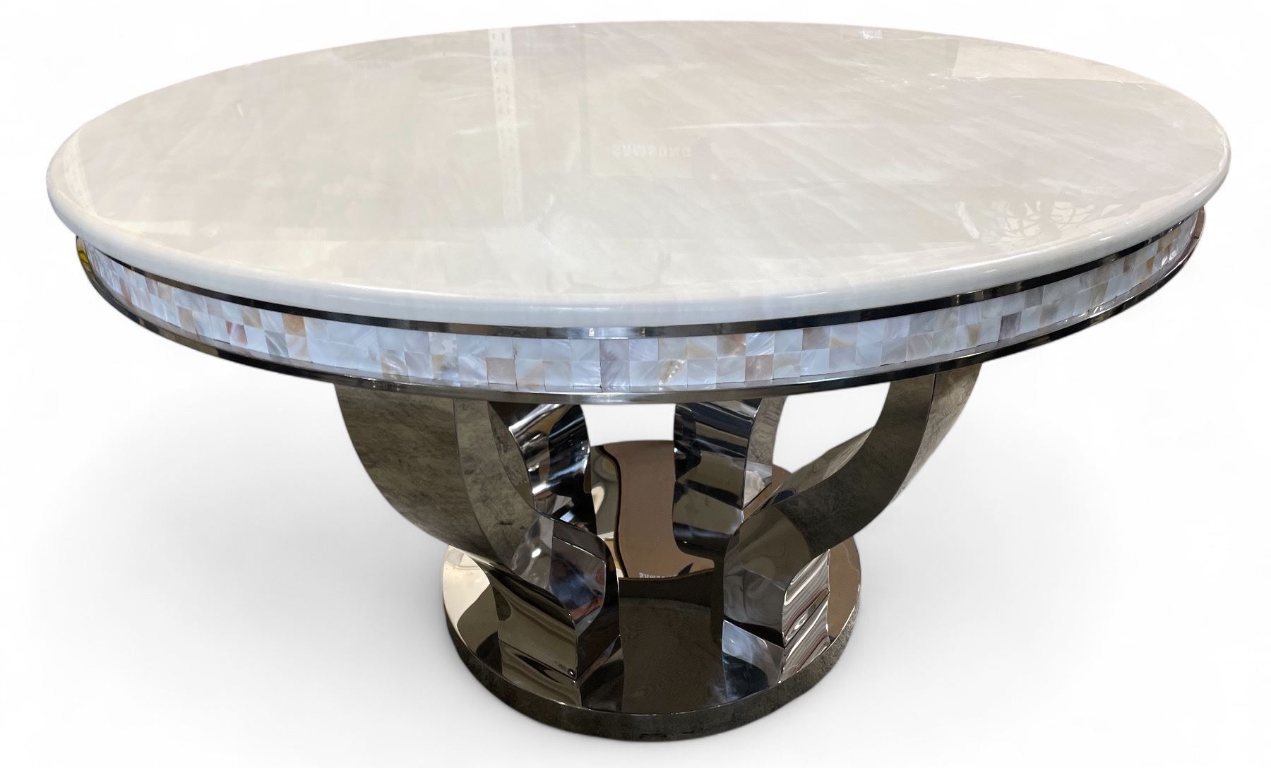 DAH - New Elegant Round White Ceramic Table with Silver Base and Tiled Edge, Approx. H30", 51" Diameter