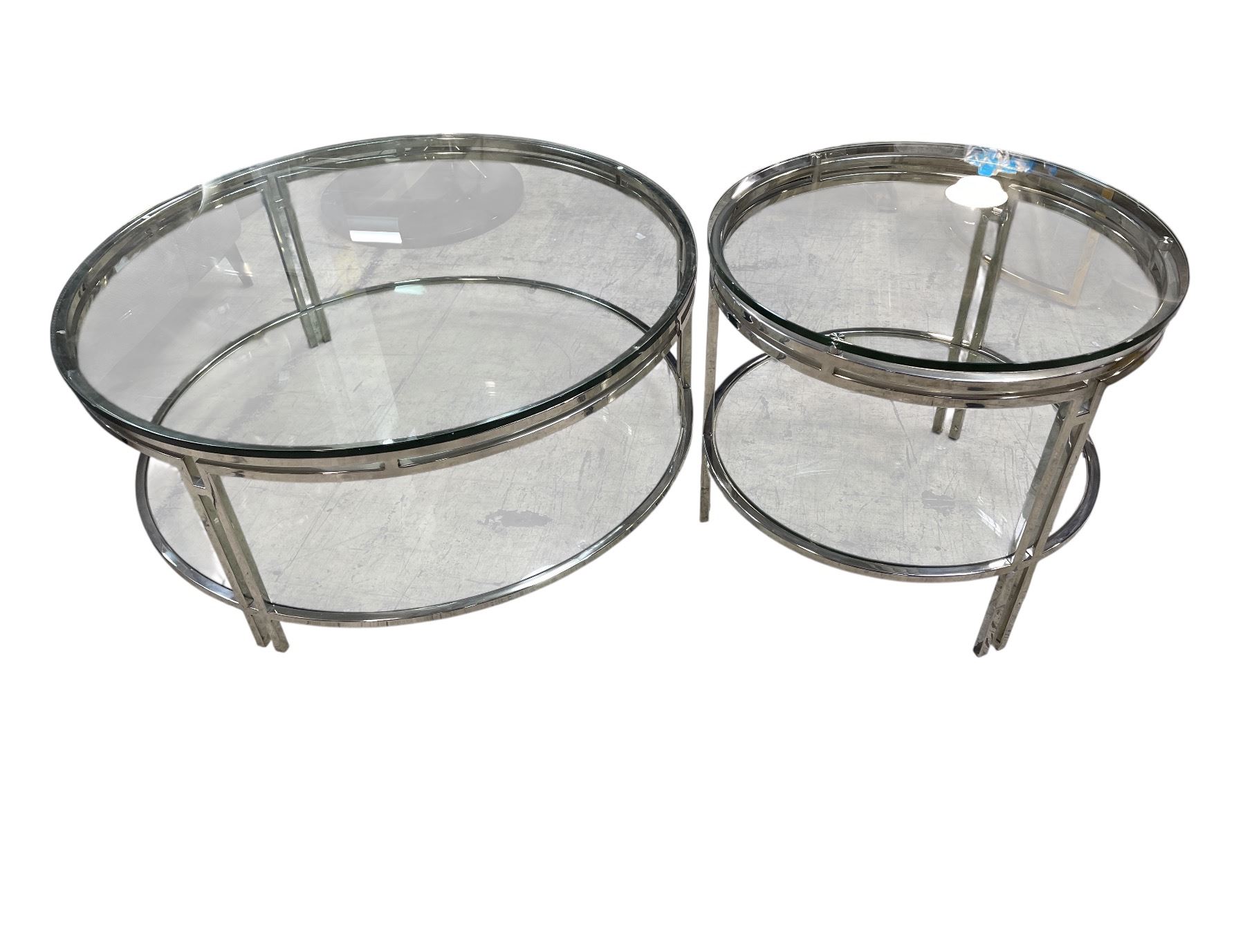 DAH - New Set of 2 Nesting Round Coffee Table with Silver Frames, Approx. H15" x 36" Diameter & H19.5" x 22" Diameter