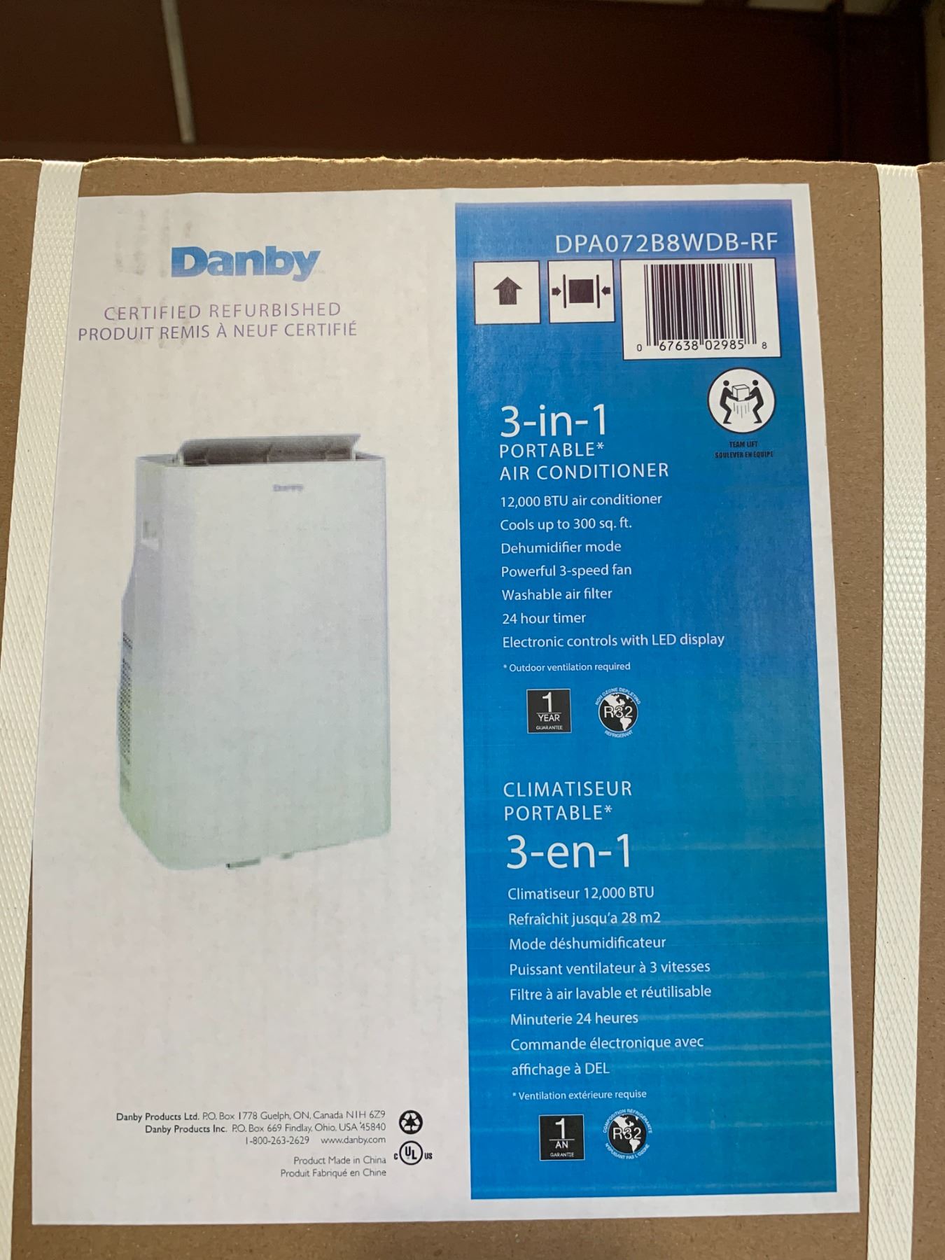 DANBY DPA072B8WDB-RF 12,000 BTU 3-IN-1 CERTIFIED EFURBISHED ELECTRIC PORTABLE AIR CONDITIONER *IN BOX*