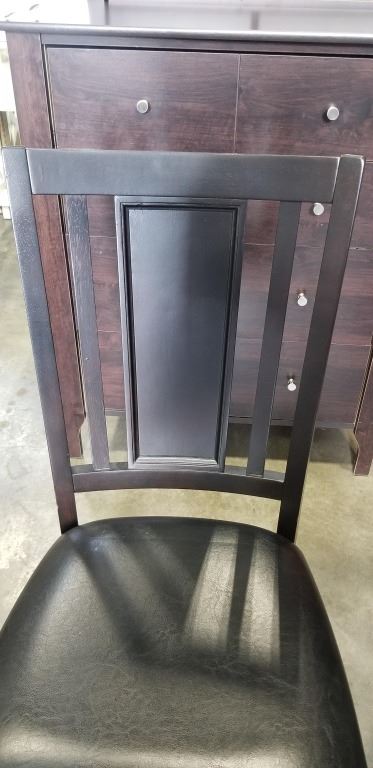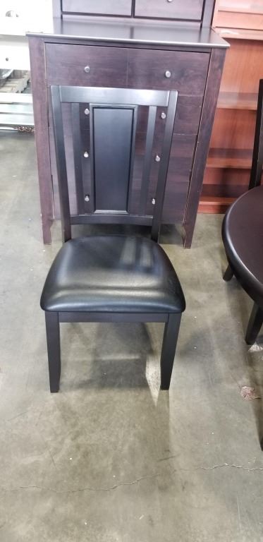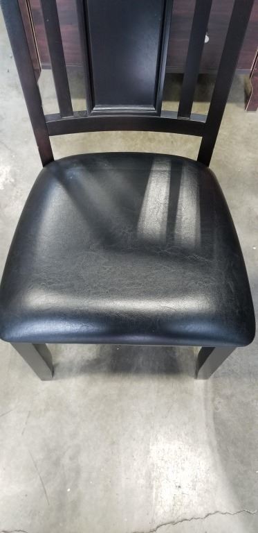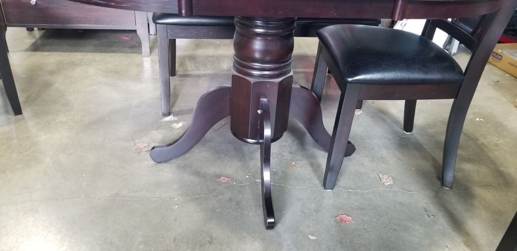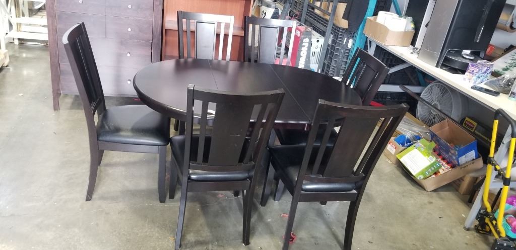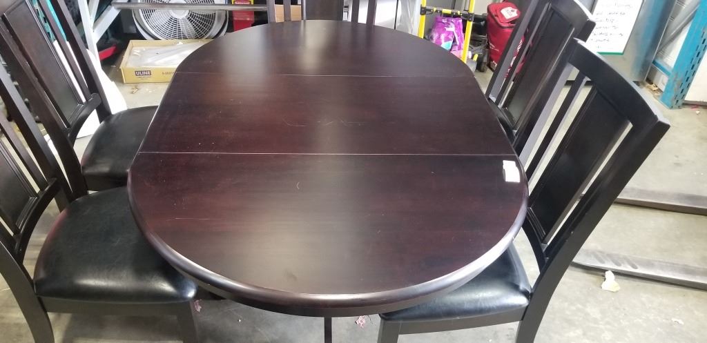 DARK FINISH PEDESTAL DINING TABLE WITH EXTENSION AND 6 LEATHER SEAT CHAIRS, GOOD CONDITION