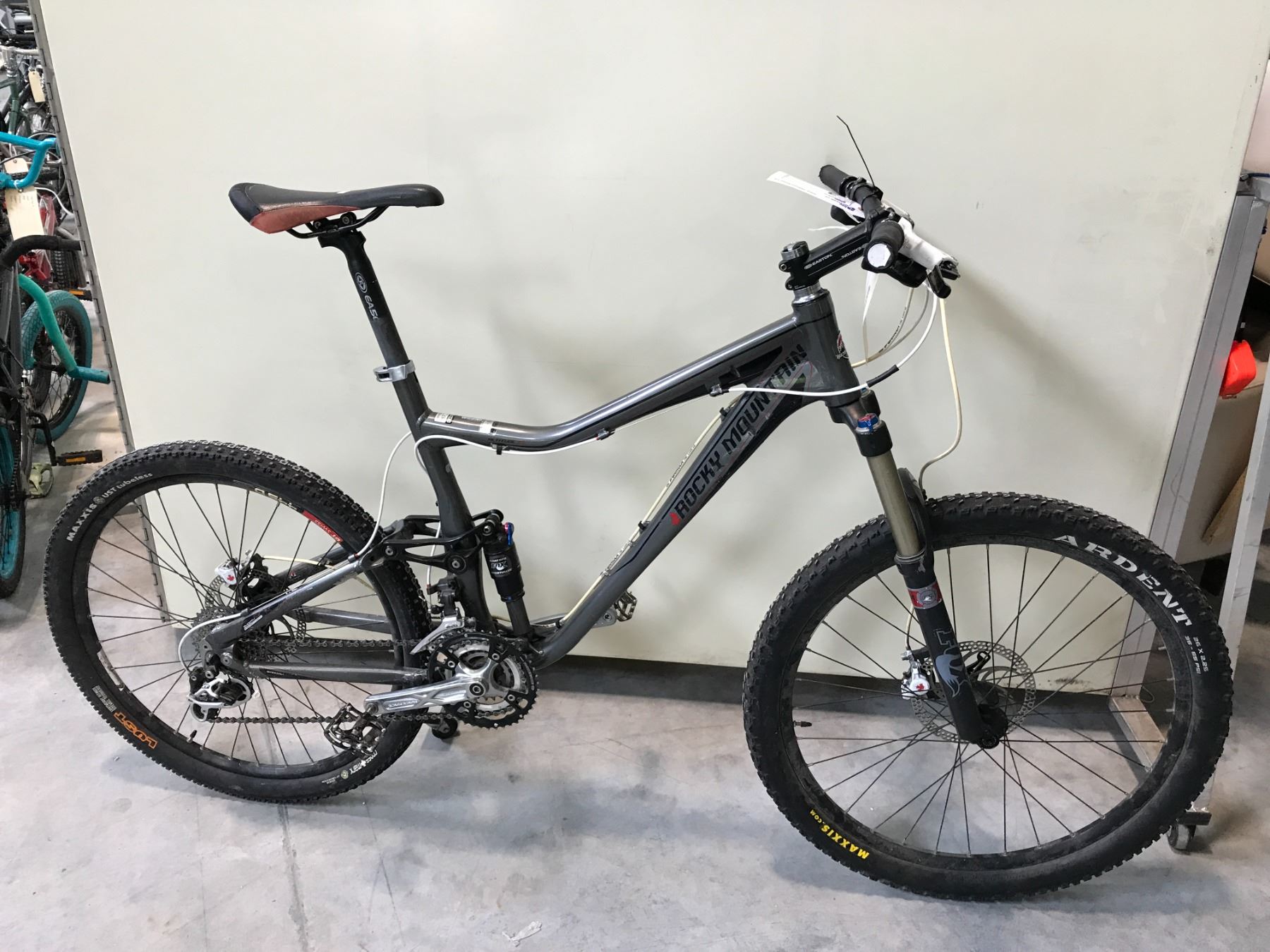 DARK GREY ROCKY MOUNTAIN ALTITUDE FULL SUSPENSION 27 SPEED, DISC BRAKES 19" FRAME MOUNTAIN BIKE