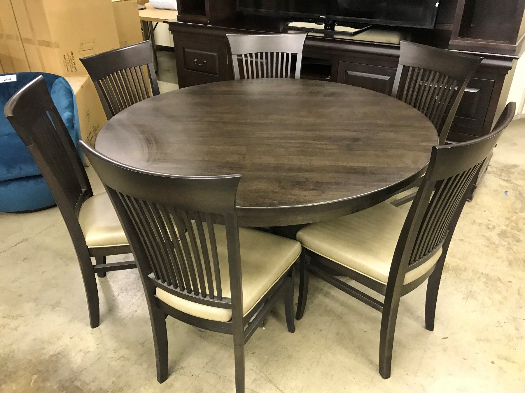 DARK WOOD 48" ROUND DINING TABLE WITH 6 MATCHING PADDED DINING CHAIRS