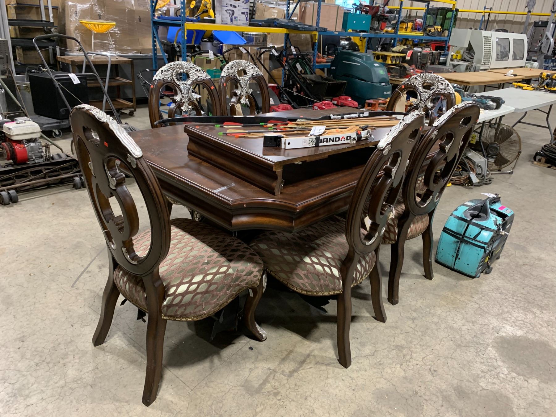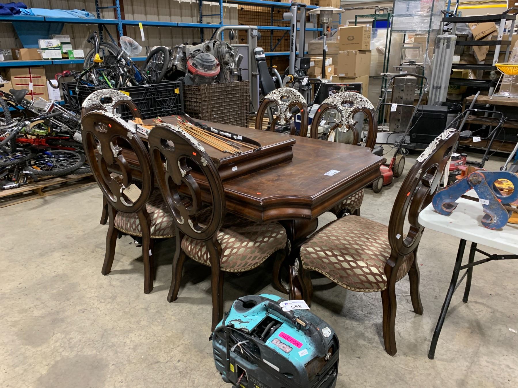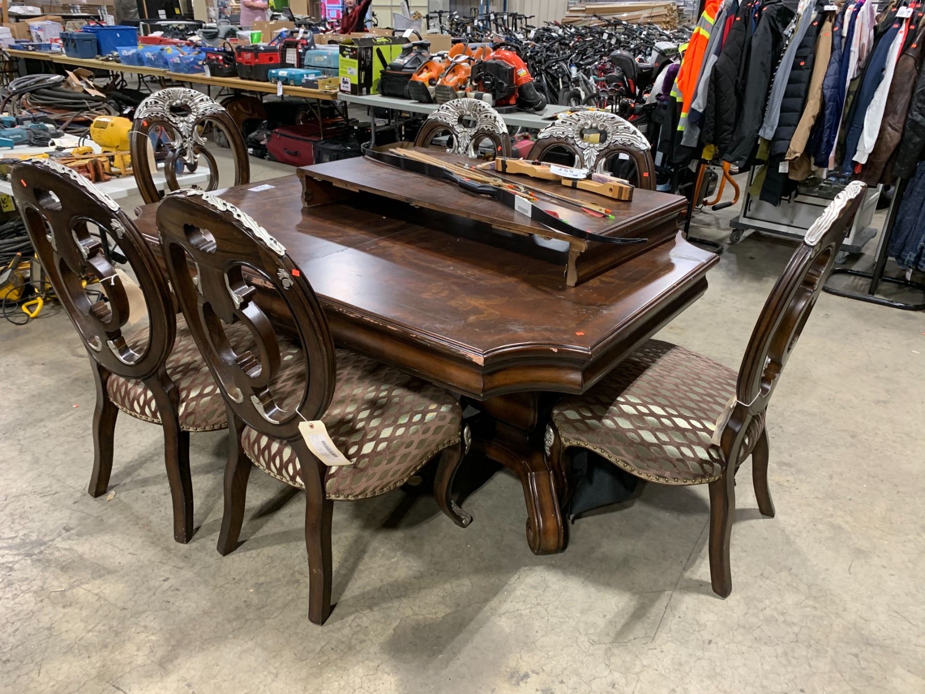 DARK WOOD SIX SEAT DINING TABLE APPROX. 6' L X 4' W X 2.5' H WITH AN EXTRA LEAF, 4' X 2' & SIX UPHOLSTERED WOODEN DINING CHAIRS