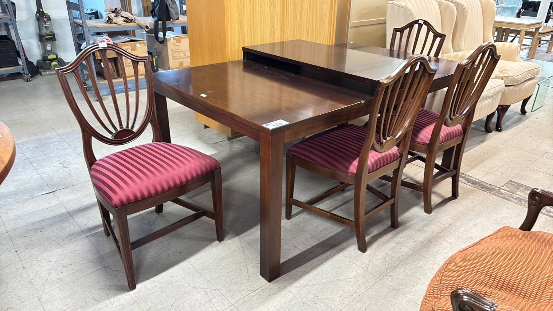 DARK WOODEN 70"W X 42"D X 30"H RECTANGULAR DINING TABLE WITH 4 CHAIRS & A LEAF - LEAF MEASURES 20"D