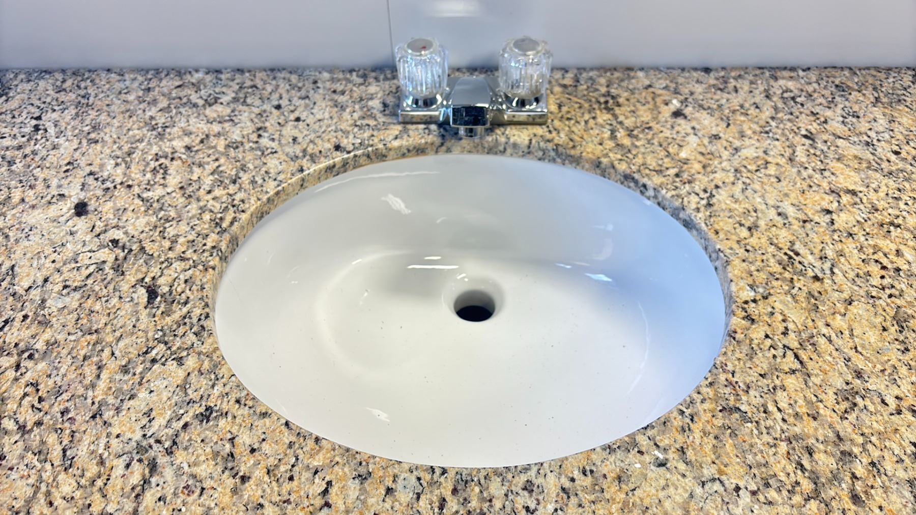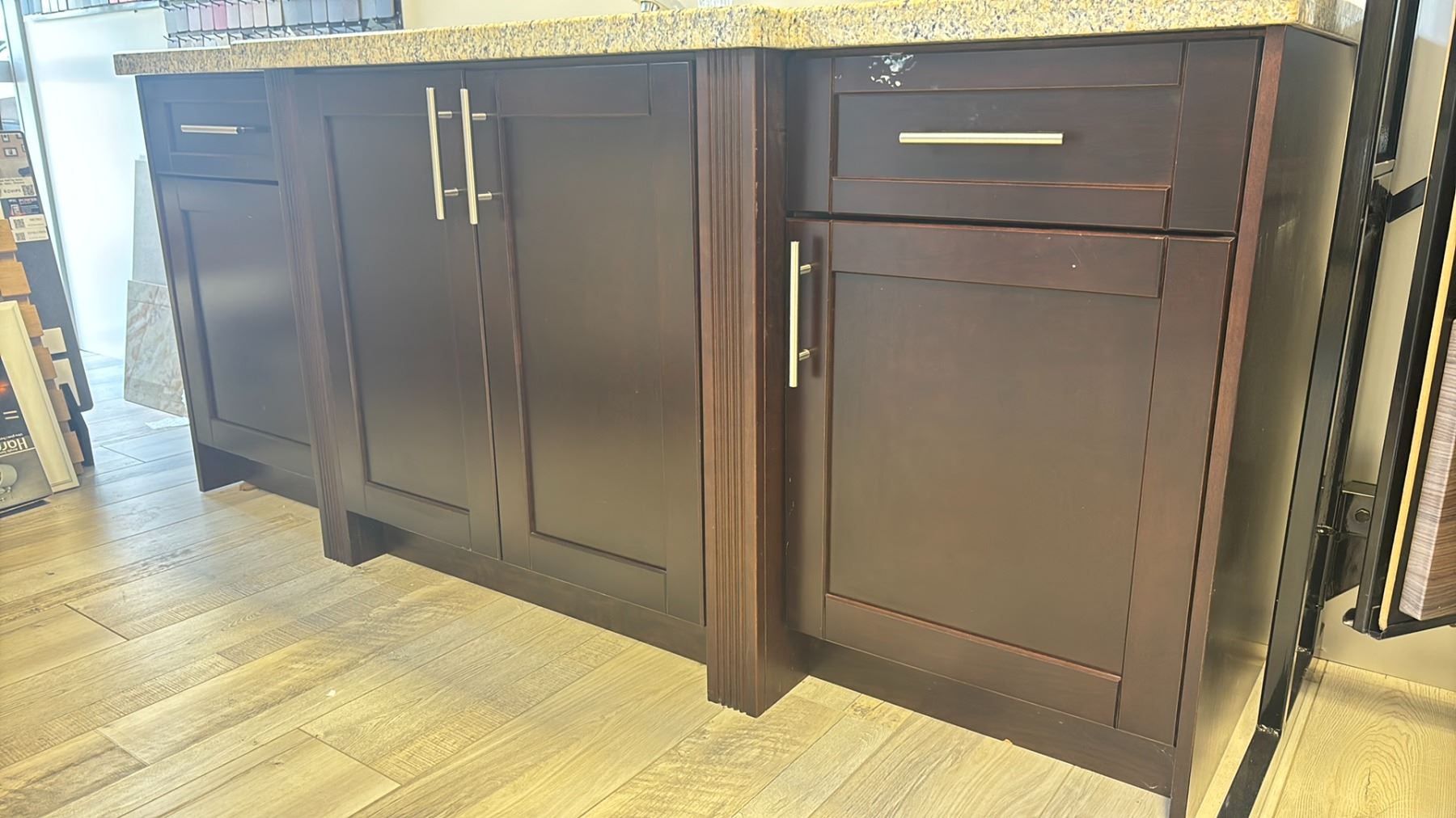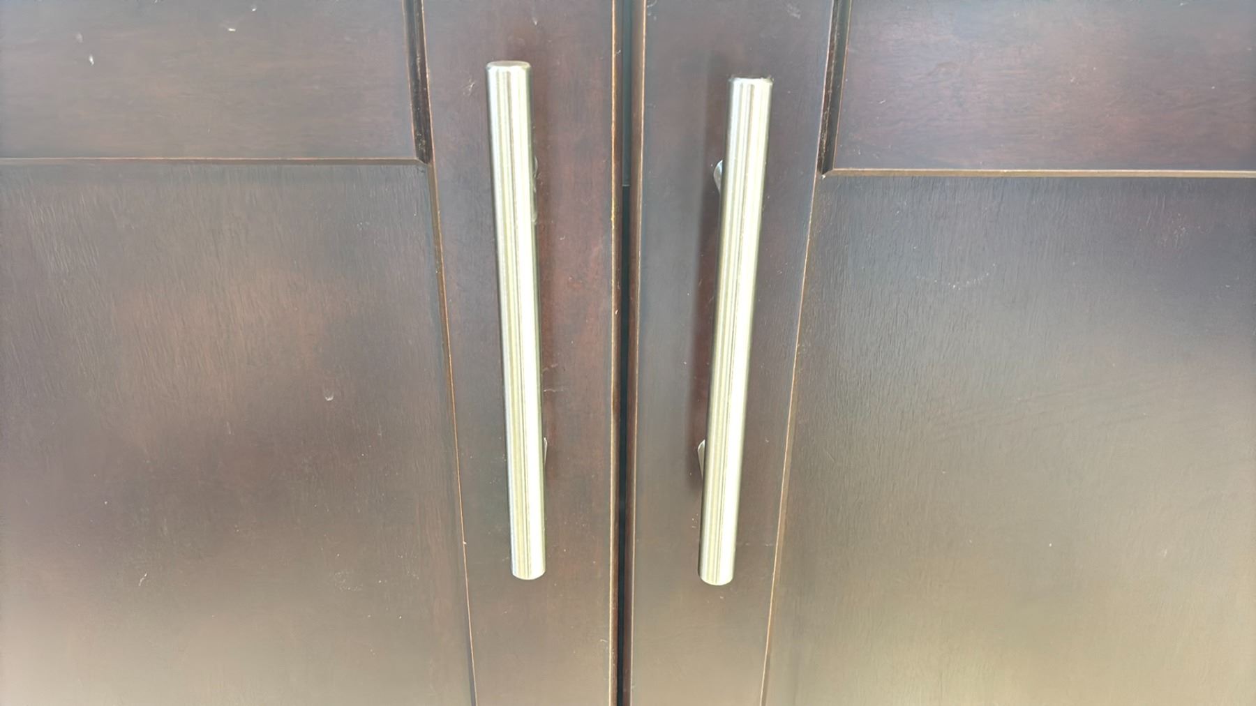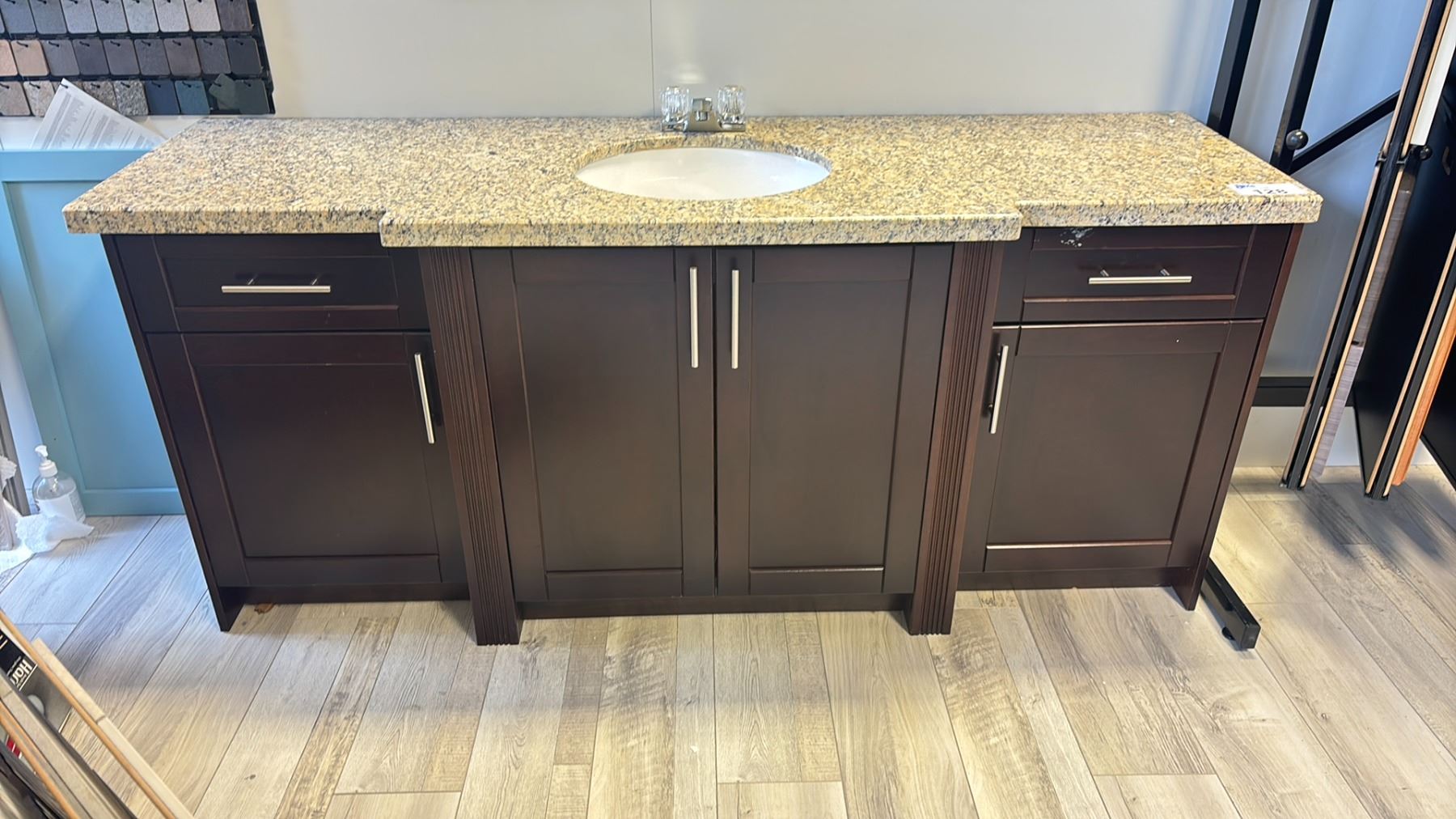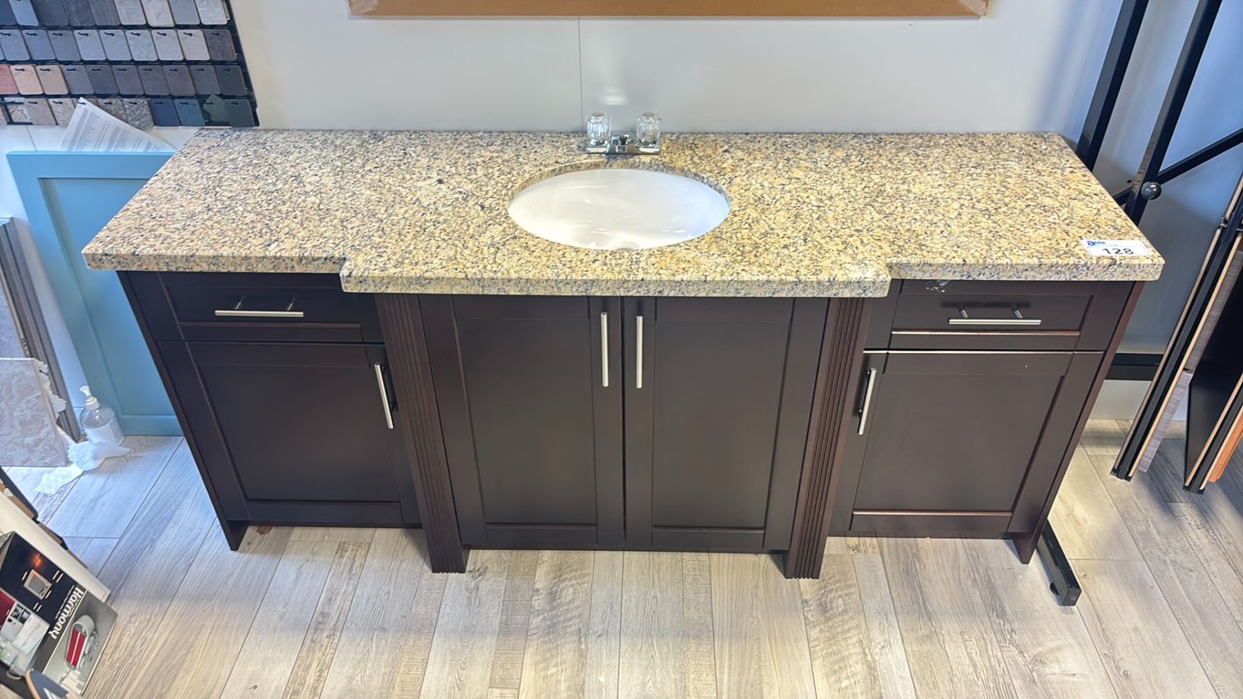 DARK WOODEN MARBLE LOOK TOP 4 DOOR 2 DRAWER VANITY WITH SINK AND FAUCET - 73"W X 23"D X 32"H