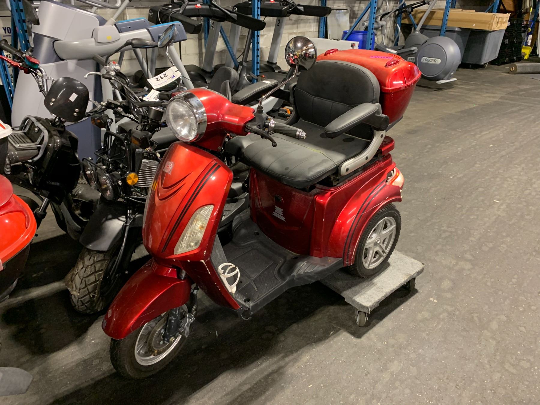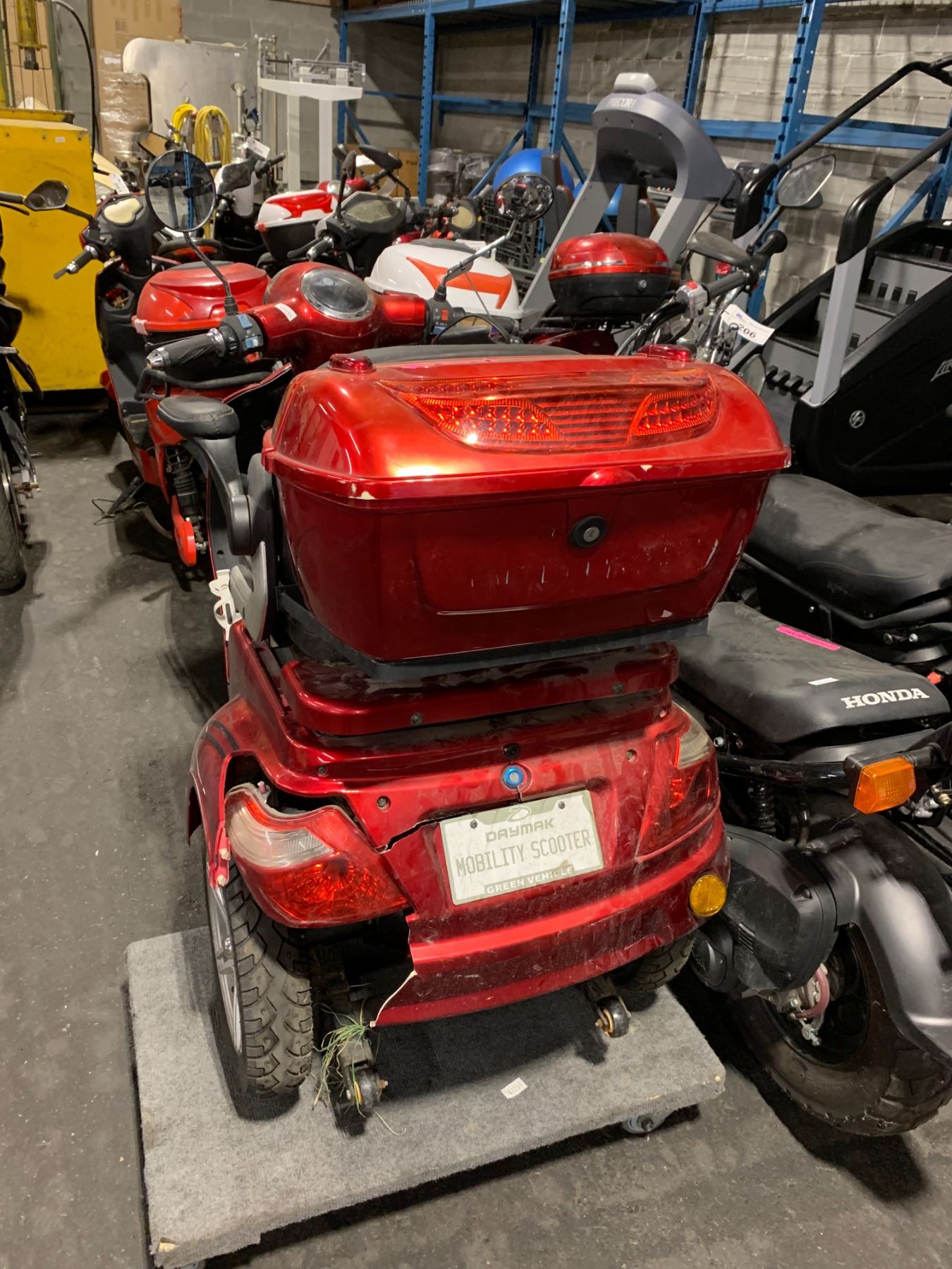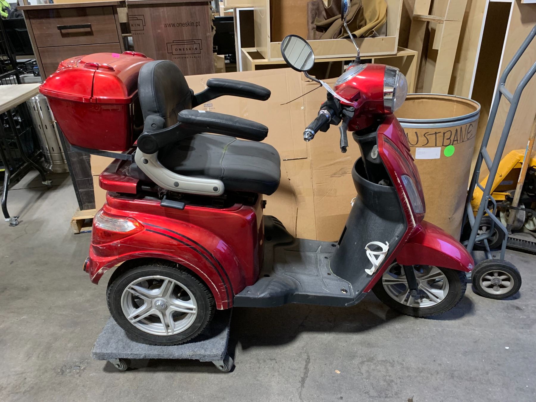 DAYMAK RED ELECTRIC ASSISTED MOBILITY SCOOTER WITH REAR CARRY BOX *NO KEY, NO CHARGER, LEFT BACKSIDE DAMAGED*