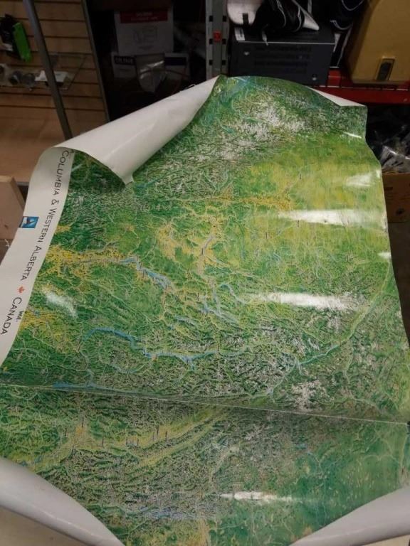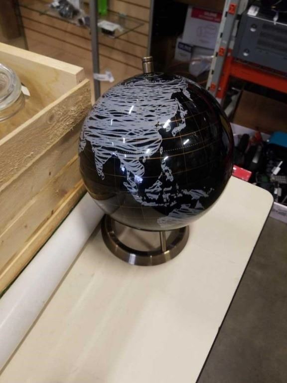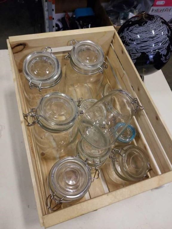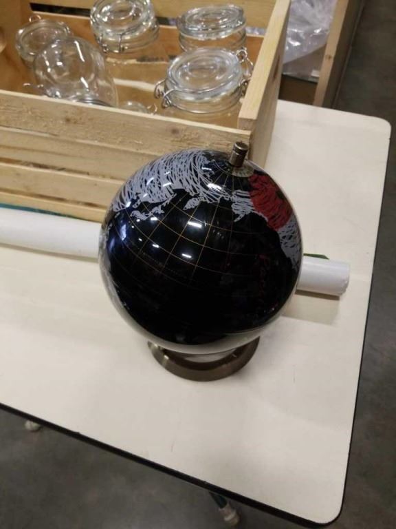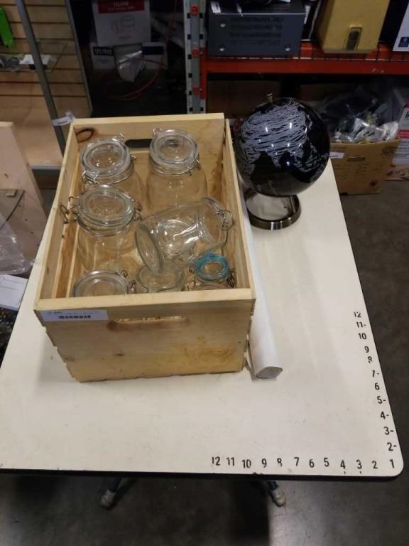 DECORATIVE GLOBE, MAP OF BRITISH COLUMBIA AND CRATE OF GLASS JARS