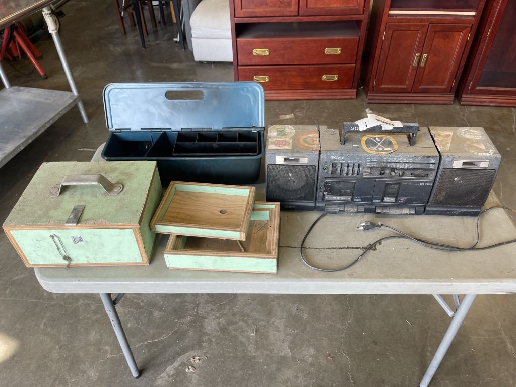 DECORATIVE NESTING BOXES, STEREO AND SHOE SHINE KIT