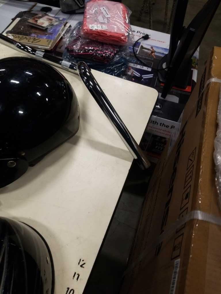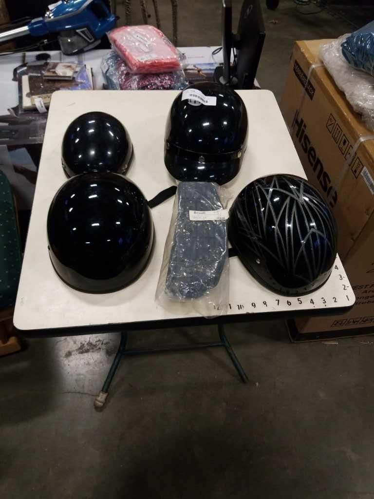 DENCO MOTORCYCLE FOOTPADS, 2 SIZE LARGE DOT HELMETS AND 2 OTHER HELMETS