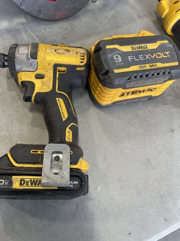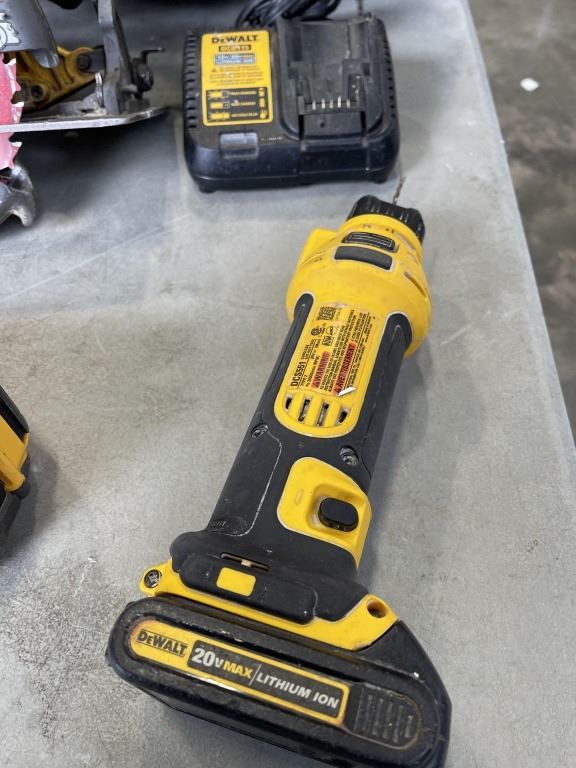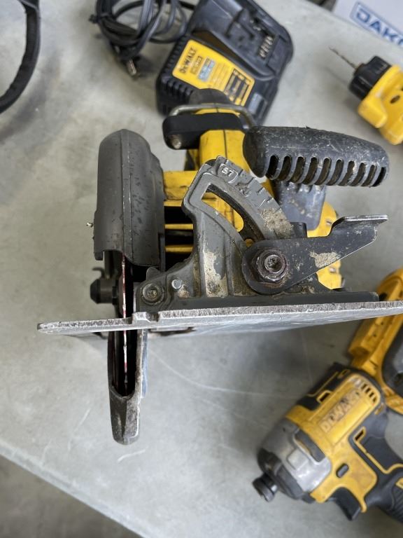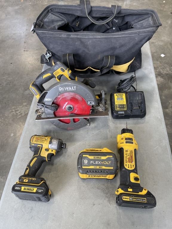 DEWALT 20V MAX CORDLESS TOOL SET WITH IMPACT DRILL, ROTARY CUT OUT TOOL, CIRCULAR SAW AND 3 BATTERIES, ONE IS 9AH FLEXVOLT, AND CHARGEER IN CARRY BAG