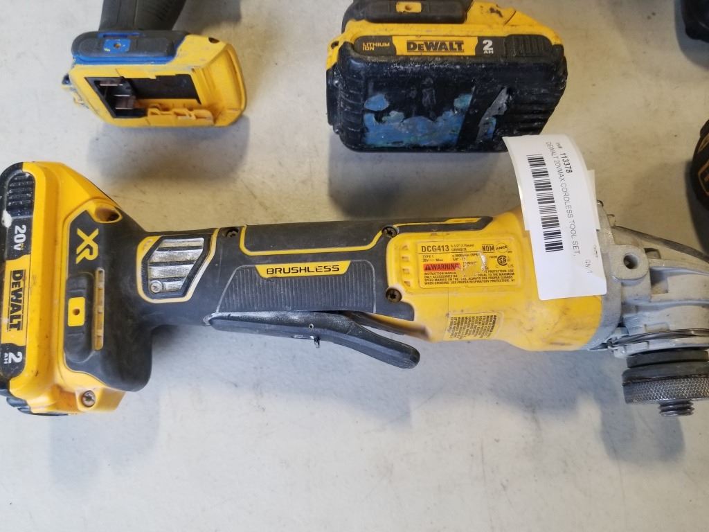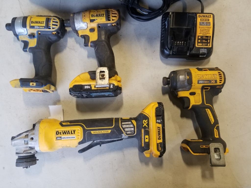 DEWALT 20VMAX CORDLESS TOOL SET, INCLUDES BRUSHLESS XR 4-1/2 INCH GRINDER, BRUSHLESS XR IMPACT DRIVER, 2 IMPACT DRIVERS, TWO 2AH BATTERIES AND CHARGER