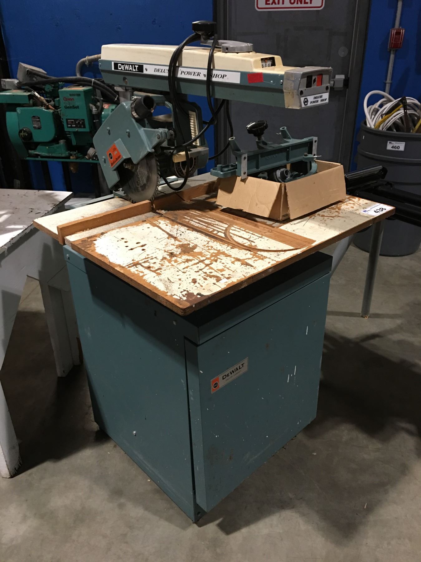 DEWALT DELUXE POWER SHOP RADIAL ARM SAW WITH ATTACHMENTS & CABINET