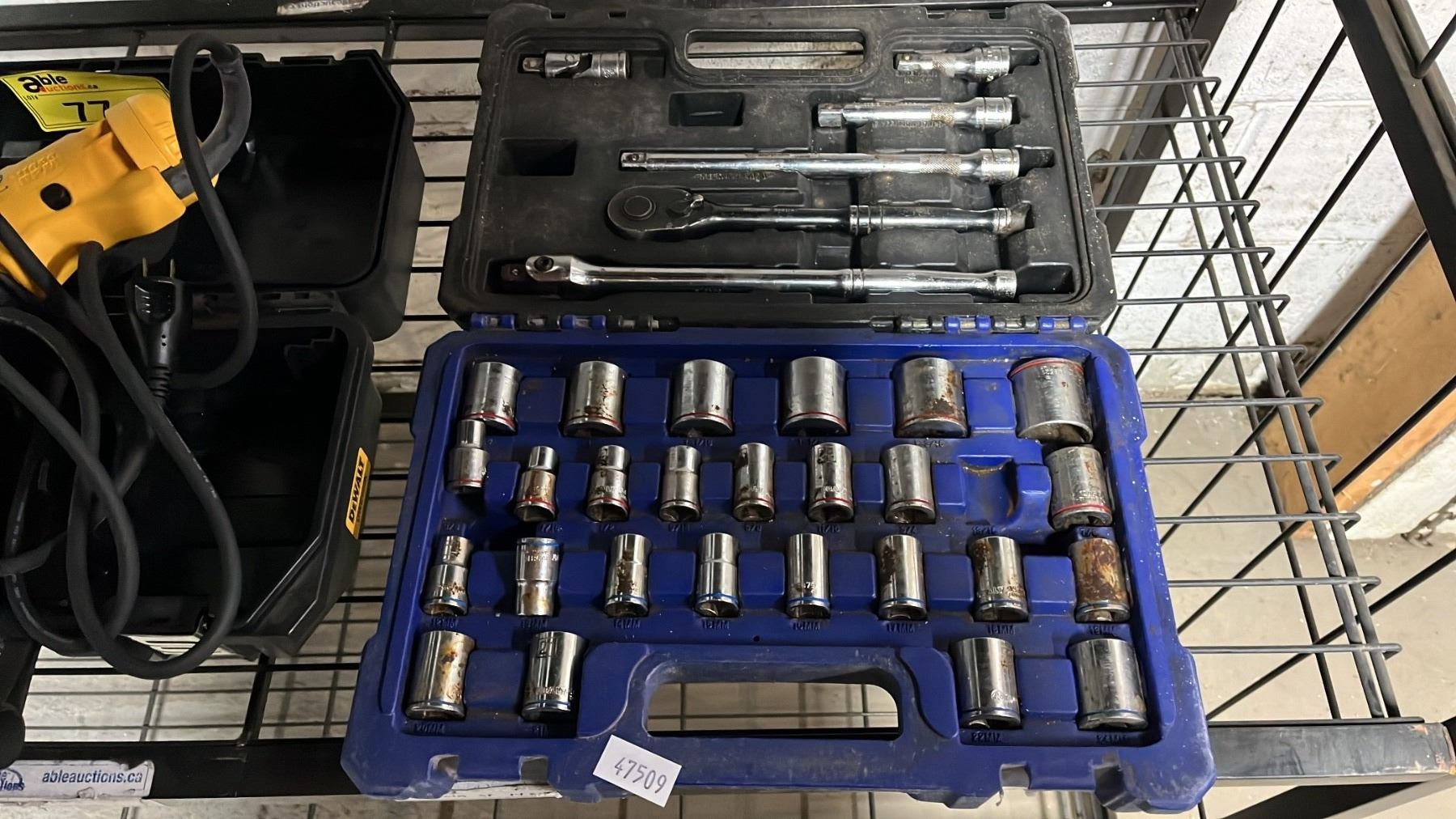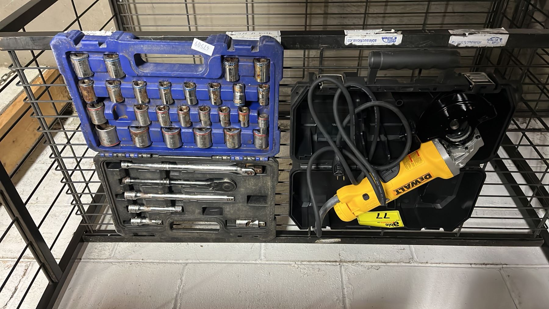 DEWALT DWE402 ELECTRIC ANGLE GRINDER IN A HARD TRANSPORT CASE & A KOBALT SOCKET SET IN A HARD TRANSPORT CASE *SOME PIECES MISSING*