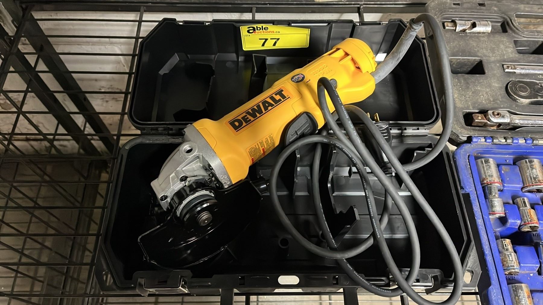 DEWALT DWE402 ELECTRIC ANGLE GRINDER IN A HARD TRANSPORT CASE & A KOBALT SOCKET SET IN A HARD