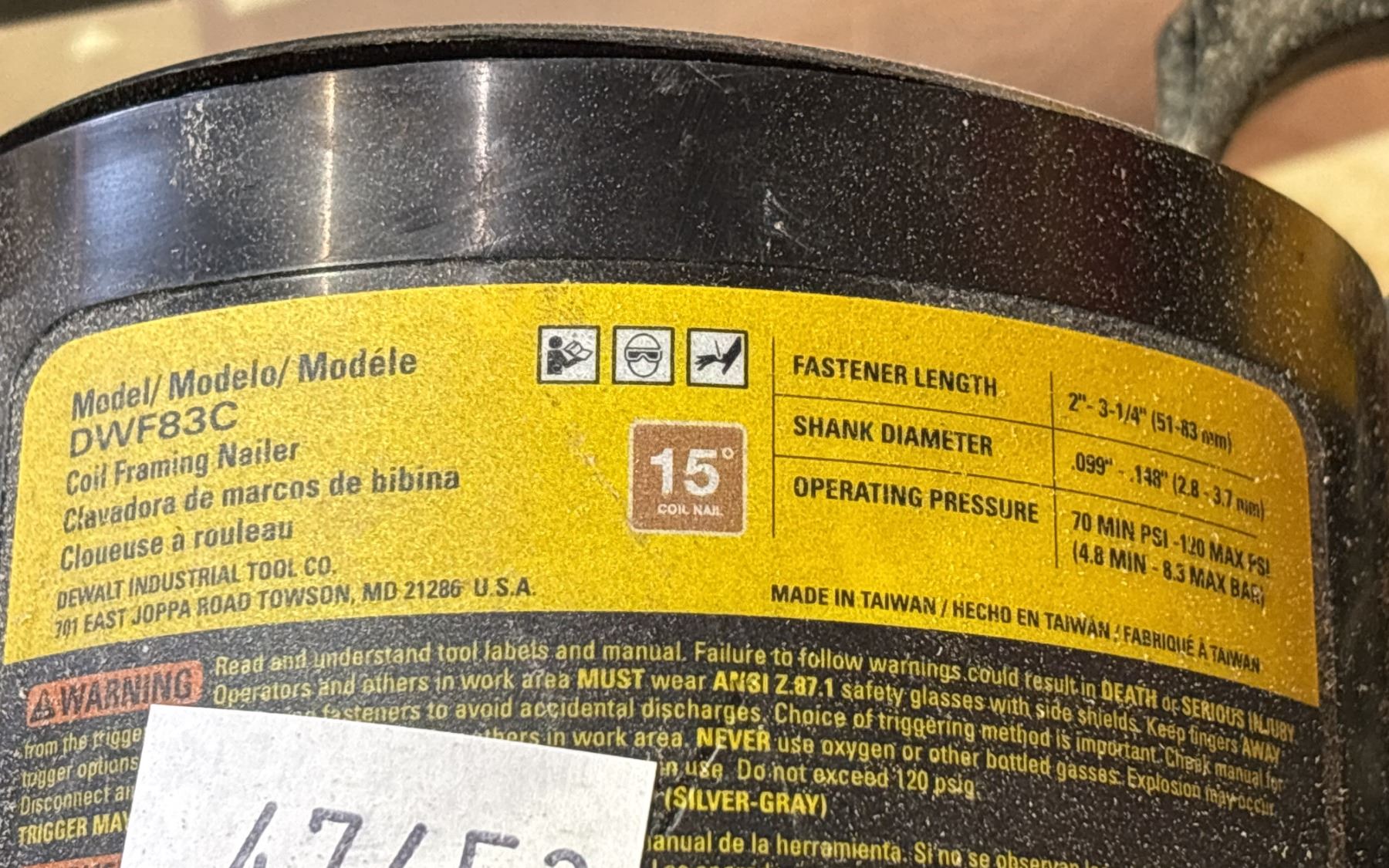 DEWALT DWF83C PNEUMATIC 15 DEGREE COIL FRAMING NAILER