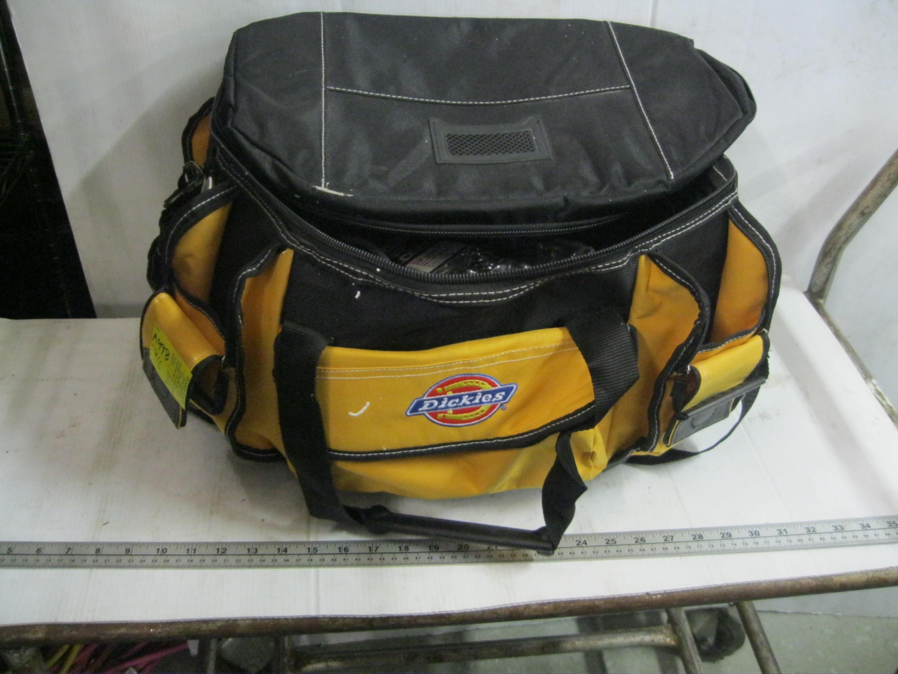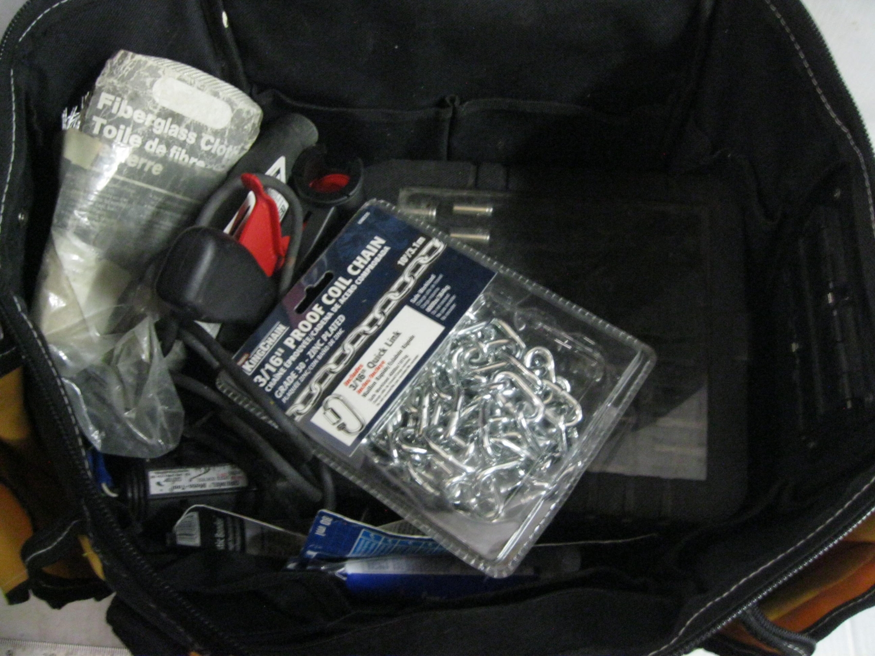 DICKIES WORK BAG W/ASST. CONTENTS: FIBERGLASS, DREMEL TOOL, CHAIN, ETC.