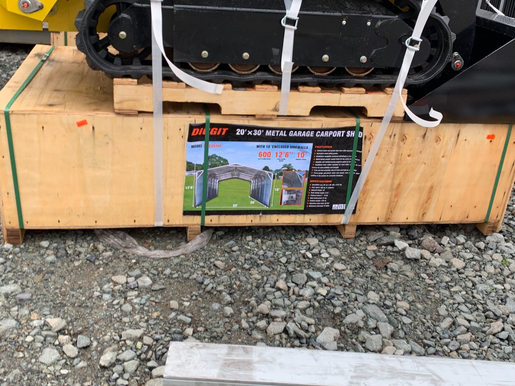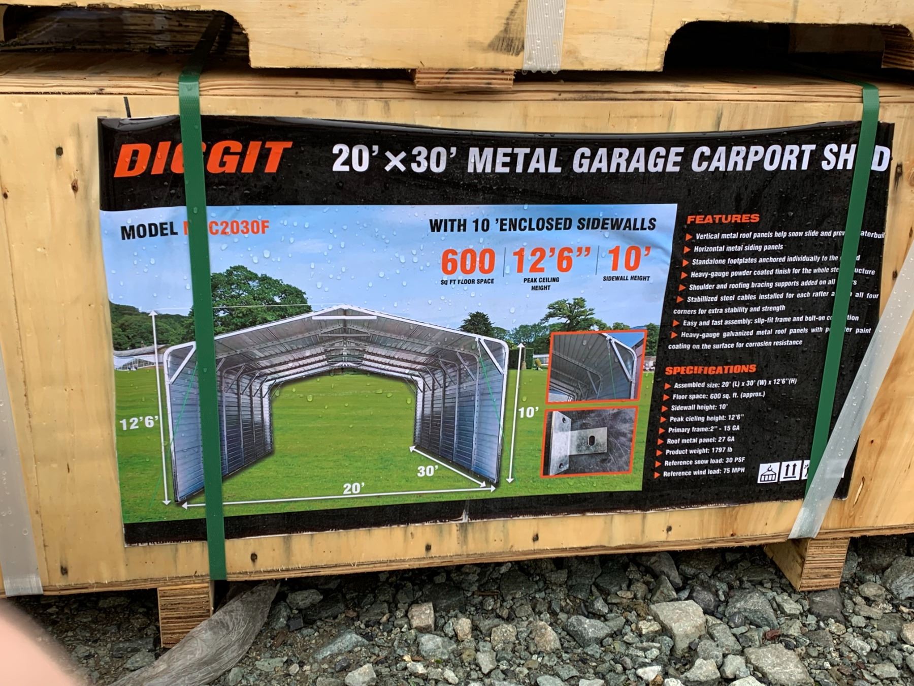 DIGGIT 20' X 30' METAL GARAGE SHED WITH 10 ENCLOSED 600 SG FT APPROX 12'6" PEAK HEIGHT * IN CRATE *