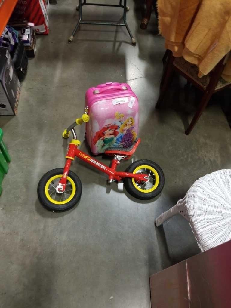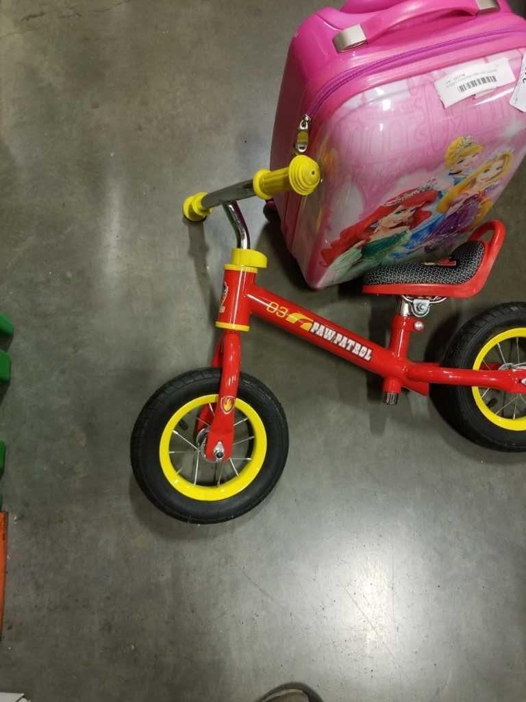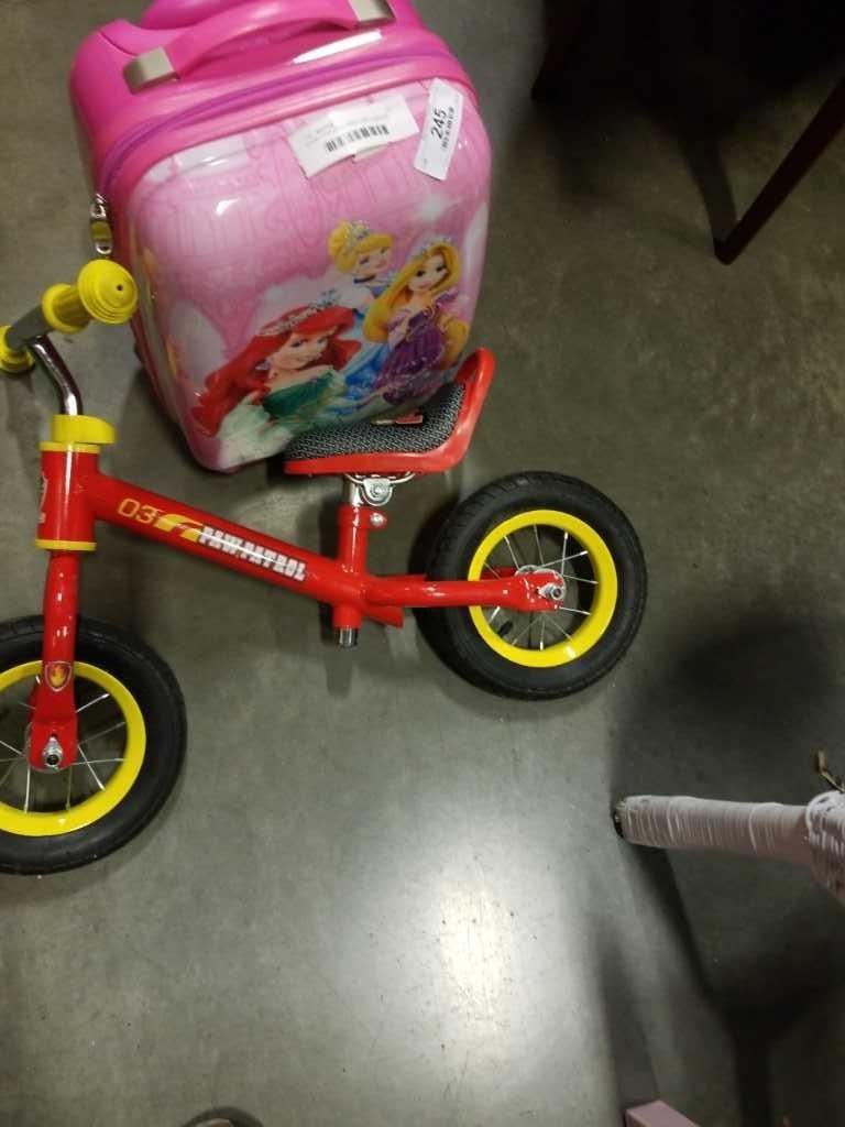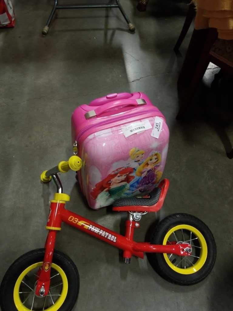 DISNEY PRINCESS HARD CASE LUGGAGE AND PAW PATROL PUSH BIKE
