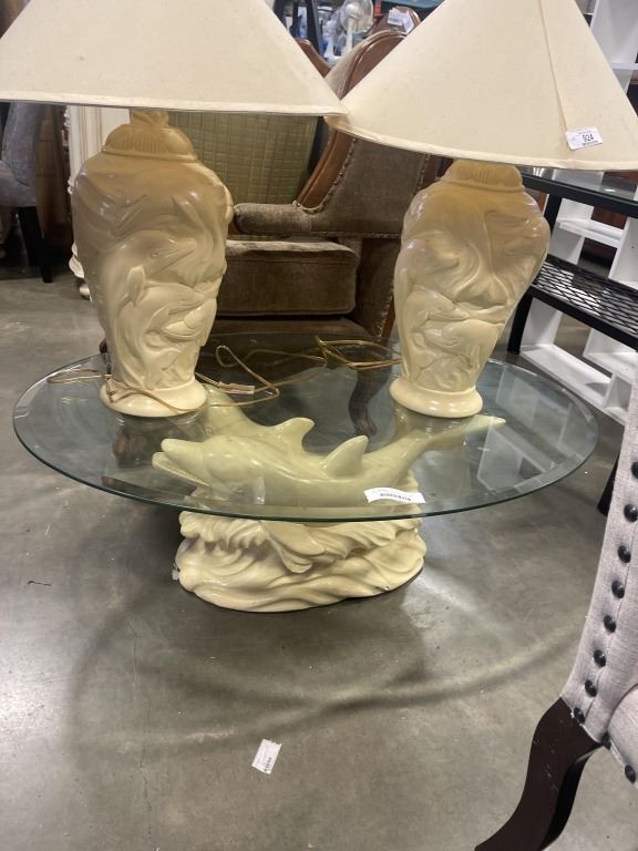 DOLPHIN GLASS TOP COFFEE TABLE AND TWO MATCHING DOLPHIN LAMPS