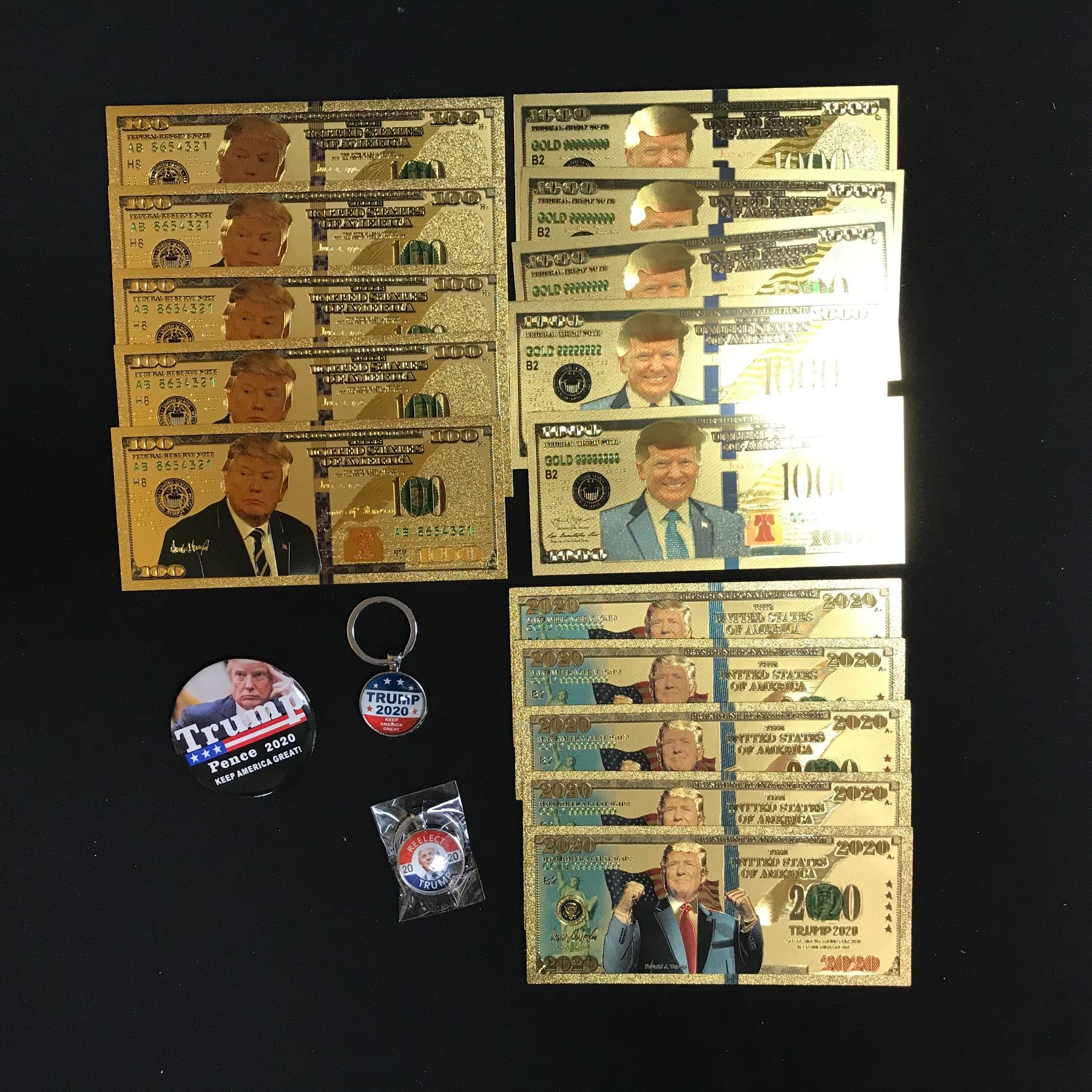 DONALD TRUMP GOLD FOILED NOVELTY BANK NOTES & PINS LOT